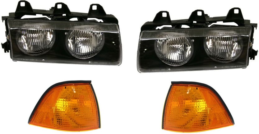 Headlight Assembly Kit for BMW 3-Series (1992-1999), Halogen, Right (Passenger) and Left (Driver), 4-Piece with Corner Lights, Replacement - Fits 318i, 325i, 328i, 330i.