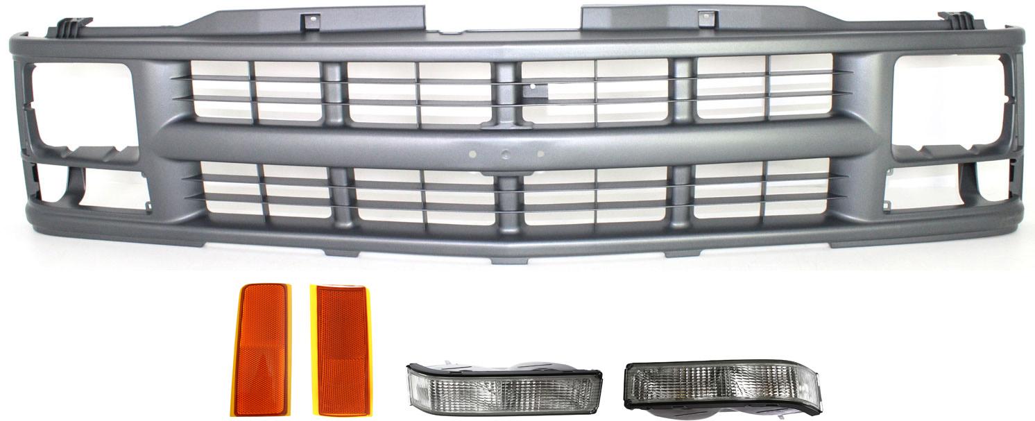 9-Piece Grille Kit for 1994-2000 Chevrolet C/K Full Size Pickup, 4-Door, Sport Utility, 2-Piece Type, Comes with Composite Headlights, Headlights, Reflectors, Side Markers, Turn Signal Lights Replacement