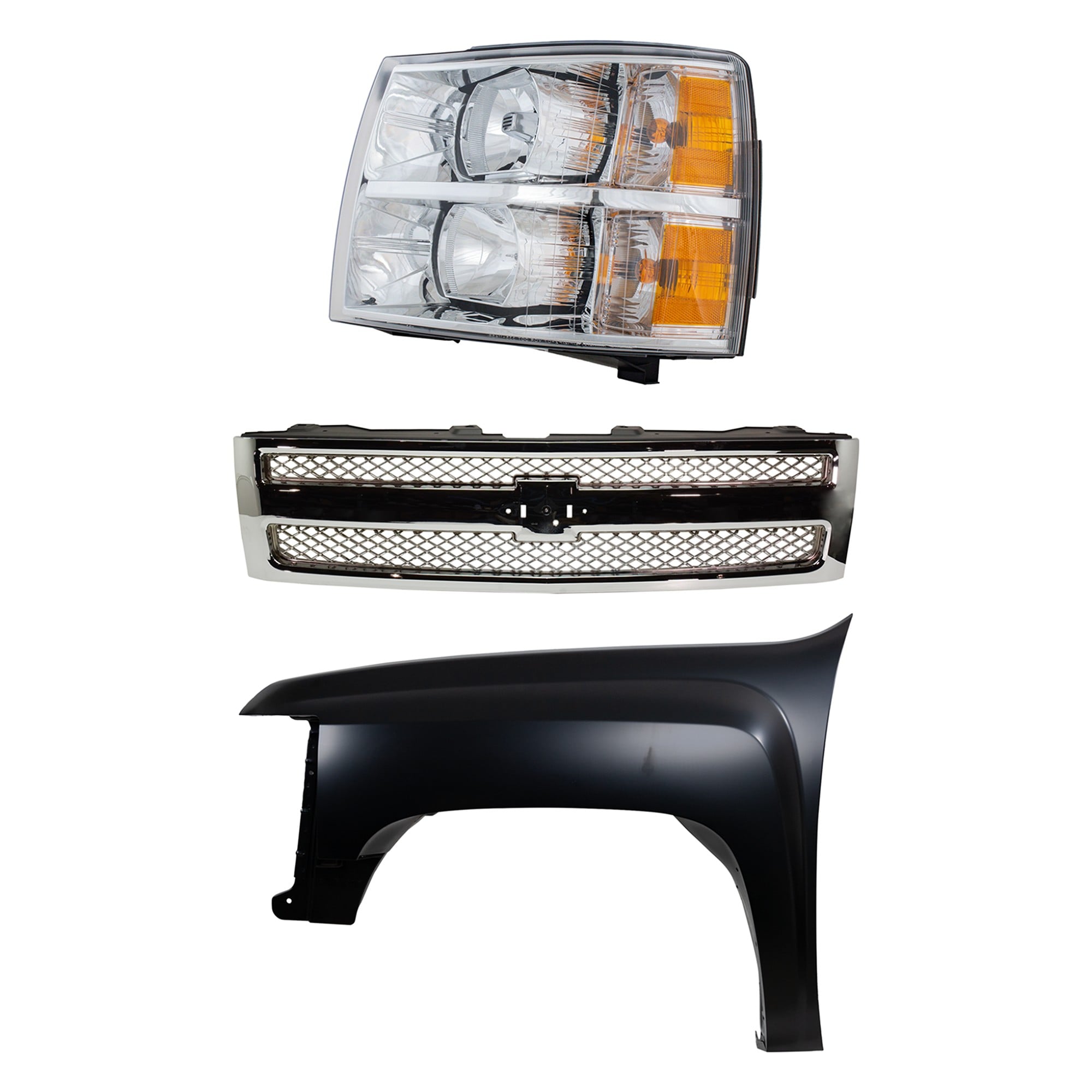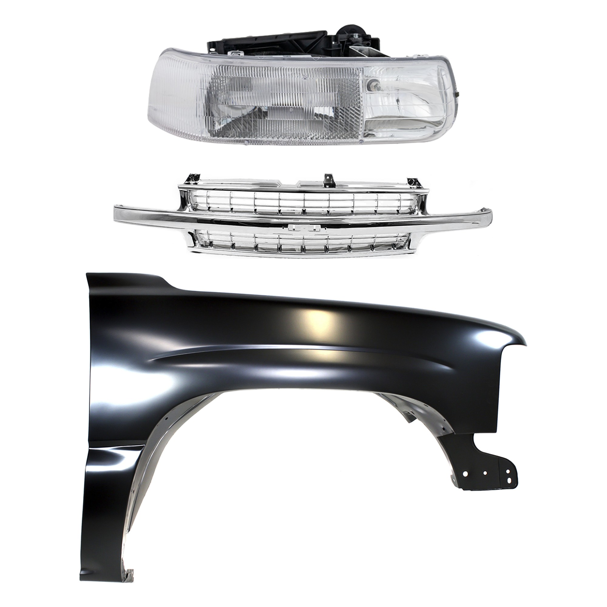 3-Piece Kit Grille for Chevrolet Silverado 1500/Silverado 2500, 1999-2002, with Cross Bar Insert, Chrome Shell & Insert, Fender, Headlight Replacement