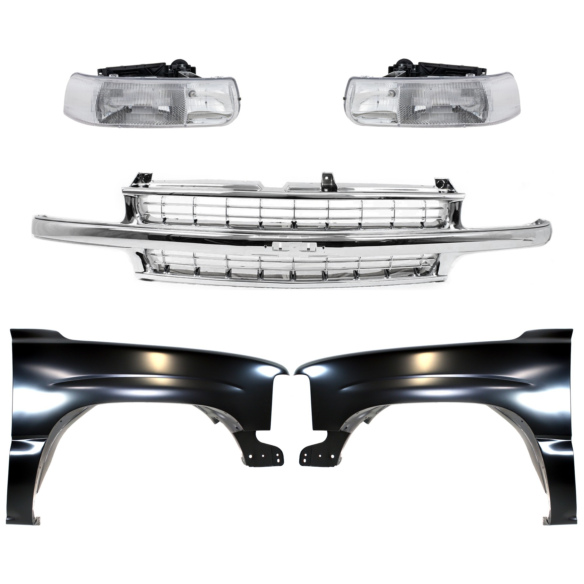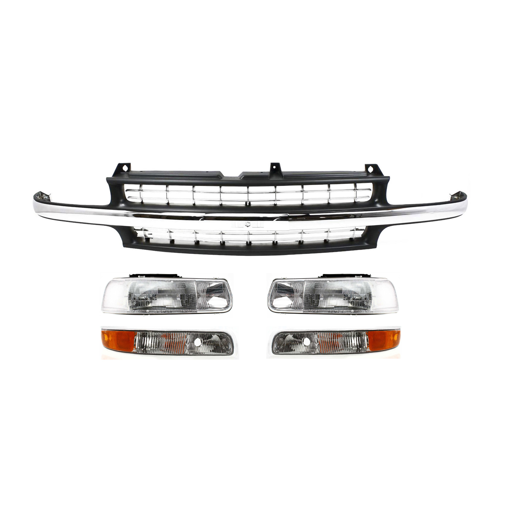 Grille and Headlight Kit for 1999-2002 Chevrolet Silverado and 2000-2006 Tahoe, 5-Piece Set with Parking Lights, Replacement