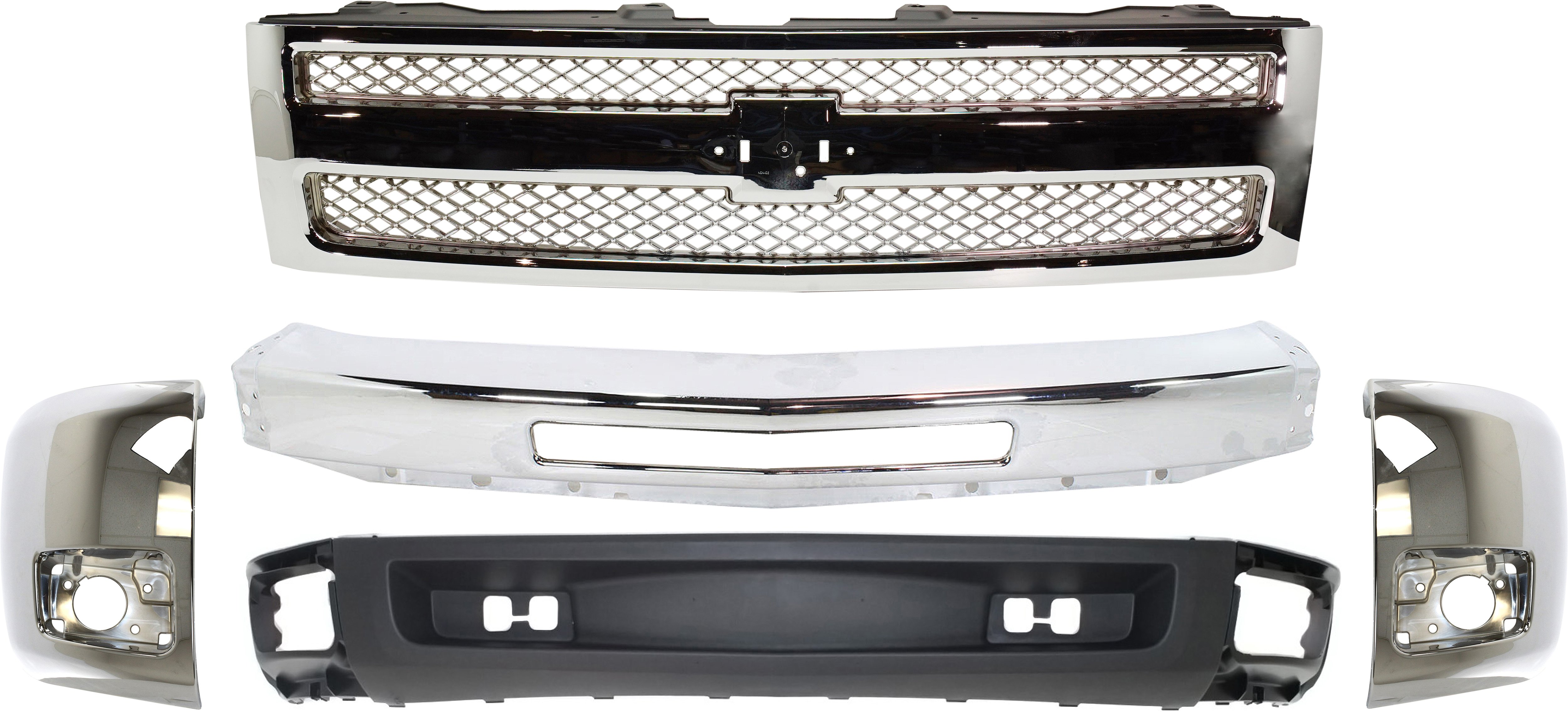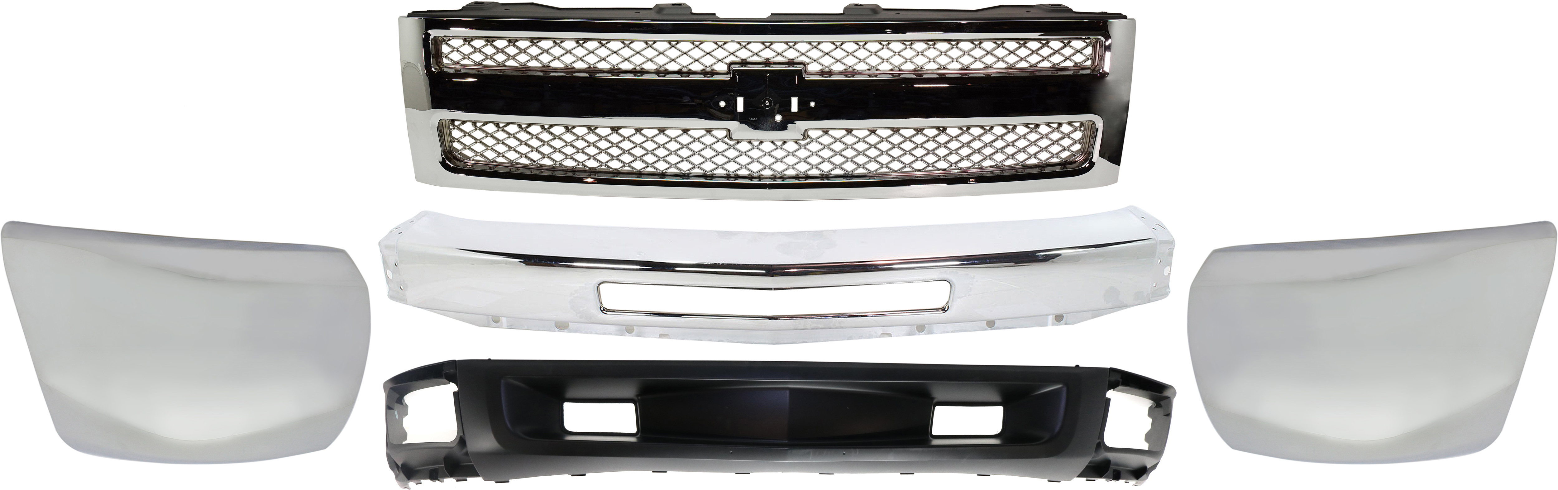 Grille Kit for 1999-2002 Chevrolet Silverado 1500/2500, Includes 3-Piece Chrome Shell and Insert, Cross Bar Insert, Fender, Headlight - Replacement Part Set