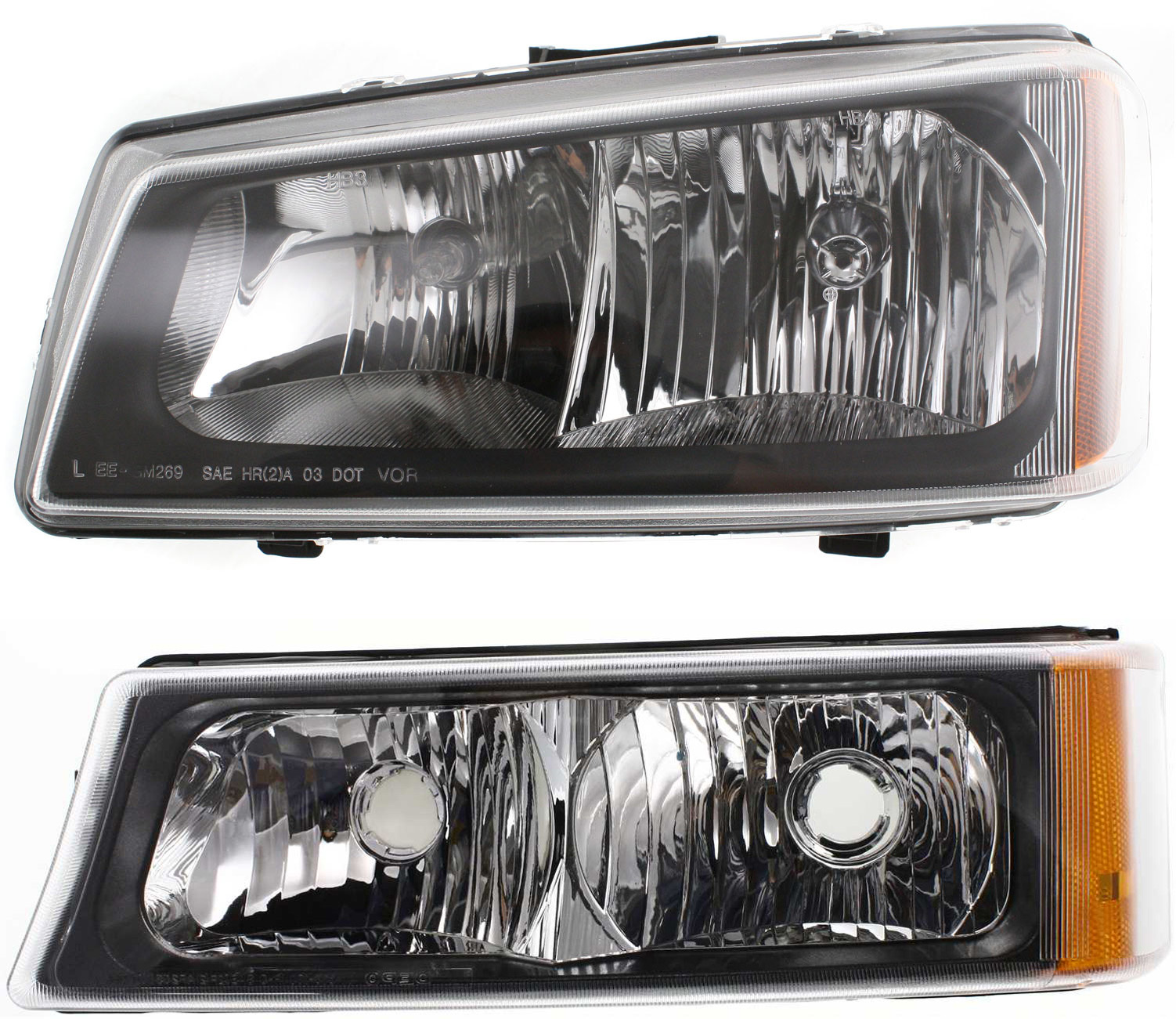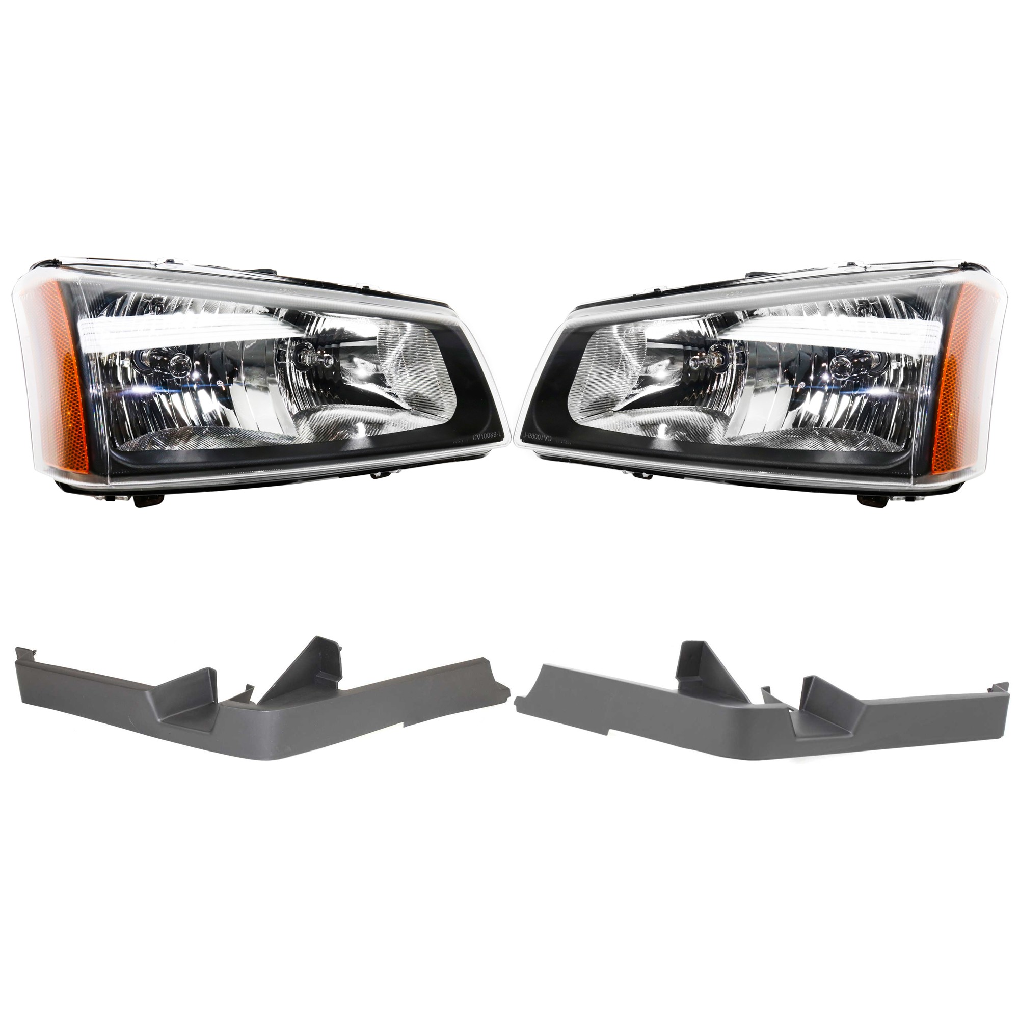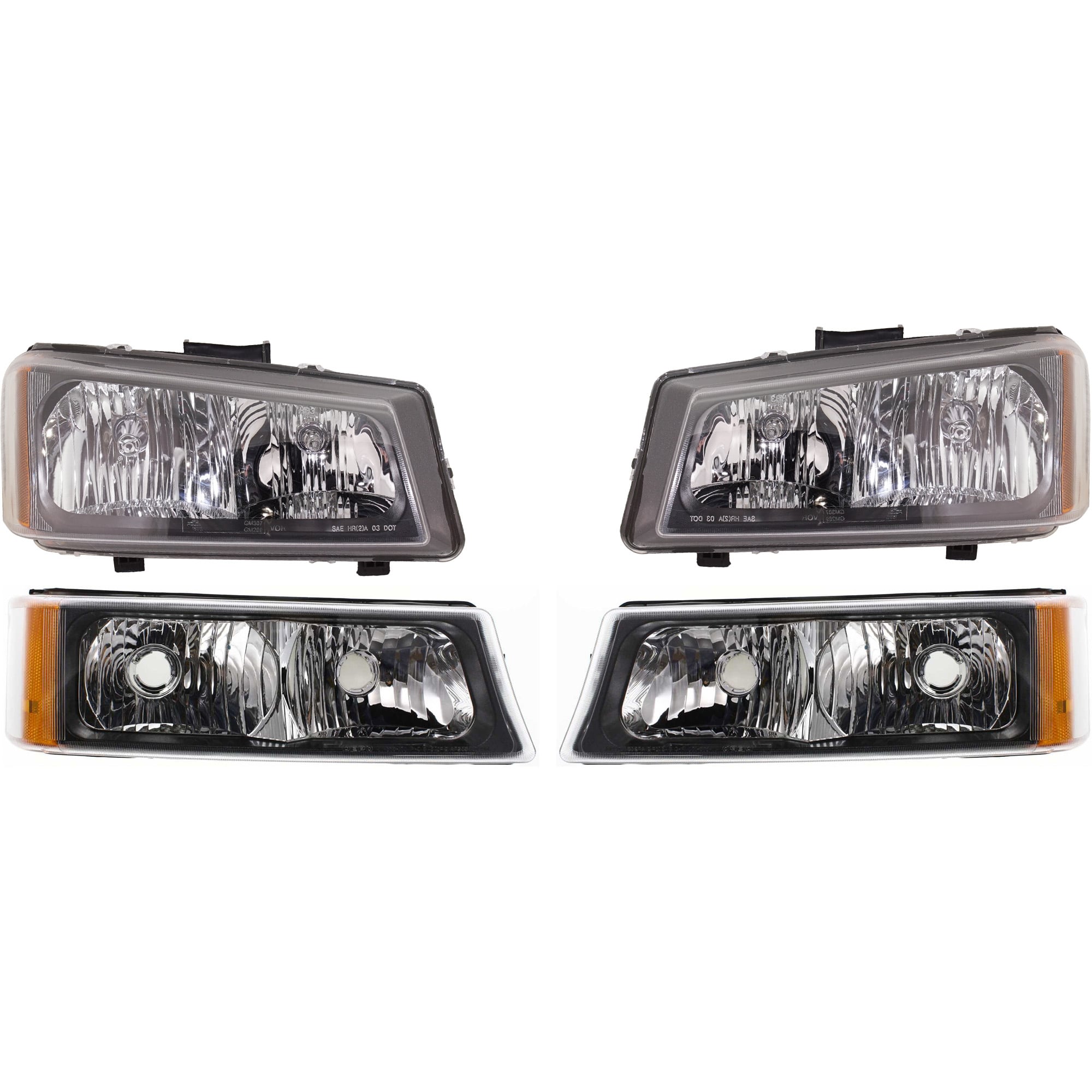 Headlight Assembly Kit for Chevrolet Avalanche 1500/2500 (2003-2006) / Silverado (2003-2007), Right (Passenger) and Left (Driver), 4-Piece, Halogen, Fluted Reflector, with Bumper Trim, Replacement