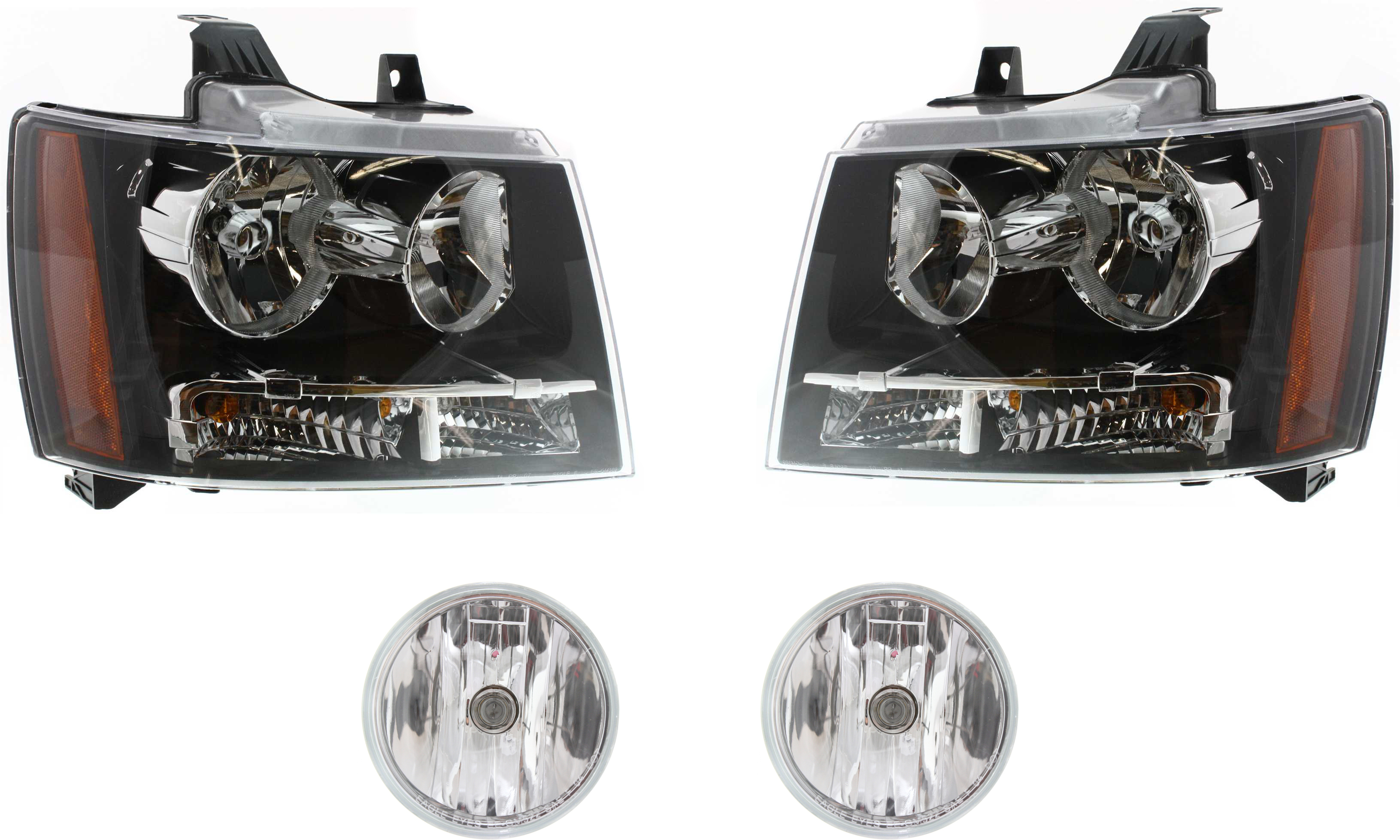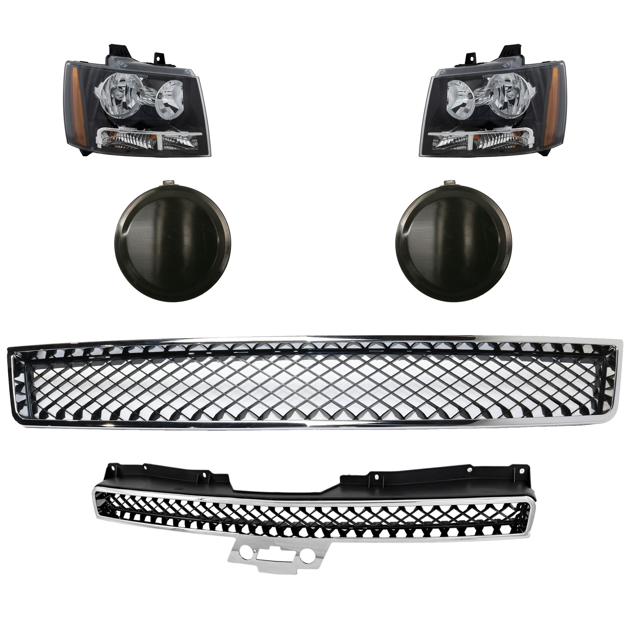 Headlight Assembly Kit for Chevrolet Avalanche 2007-2013, Tahoe 2007-2014, Right (Passenger) and Left (Driver), 6-Piece, Halogen, with Bumper Grille, Fog Light Cover, Grille Assembly, Replacement