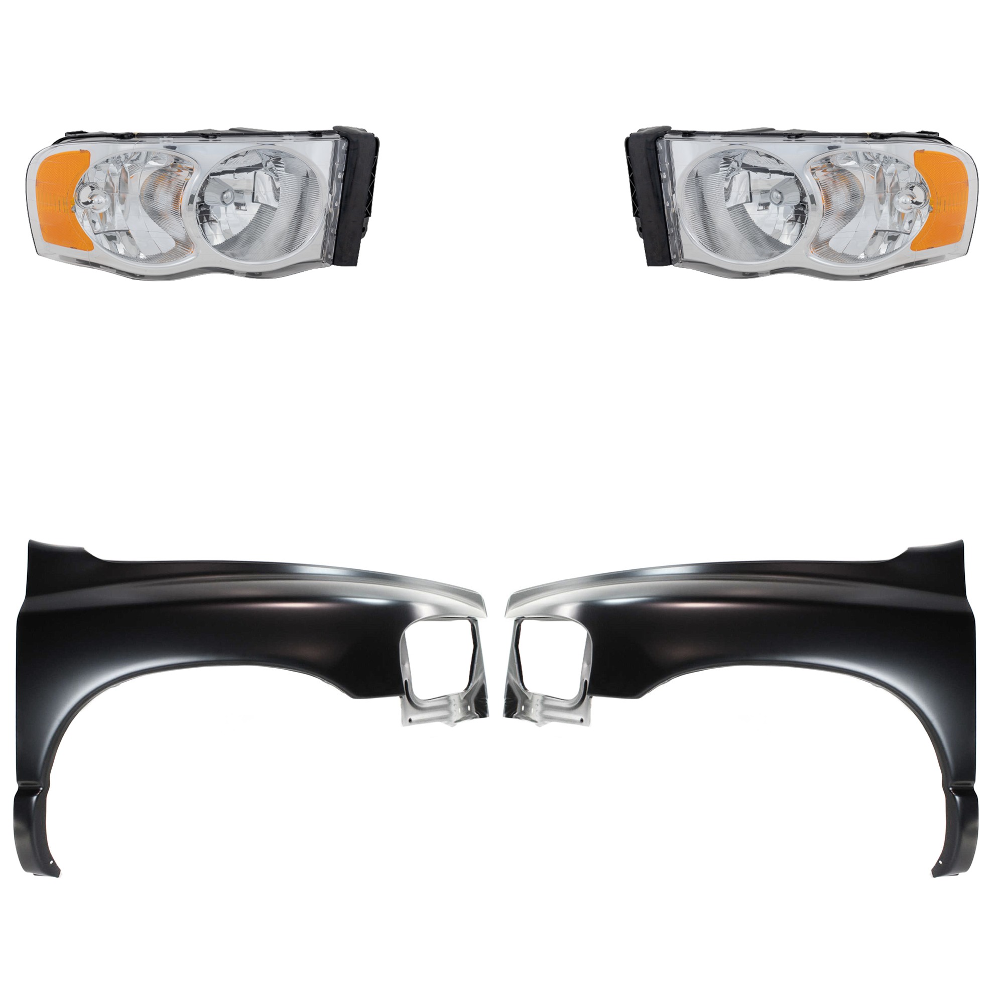 Front Fender for DODGE FULL SIZE PICKUP 2002-2005 Right (Passenger) and Left (Driver), Primed (Ready to Paint), 4-Piece Kit with Headlights, Replacement