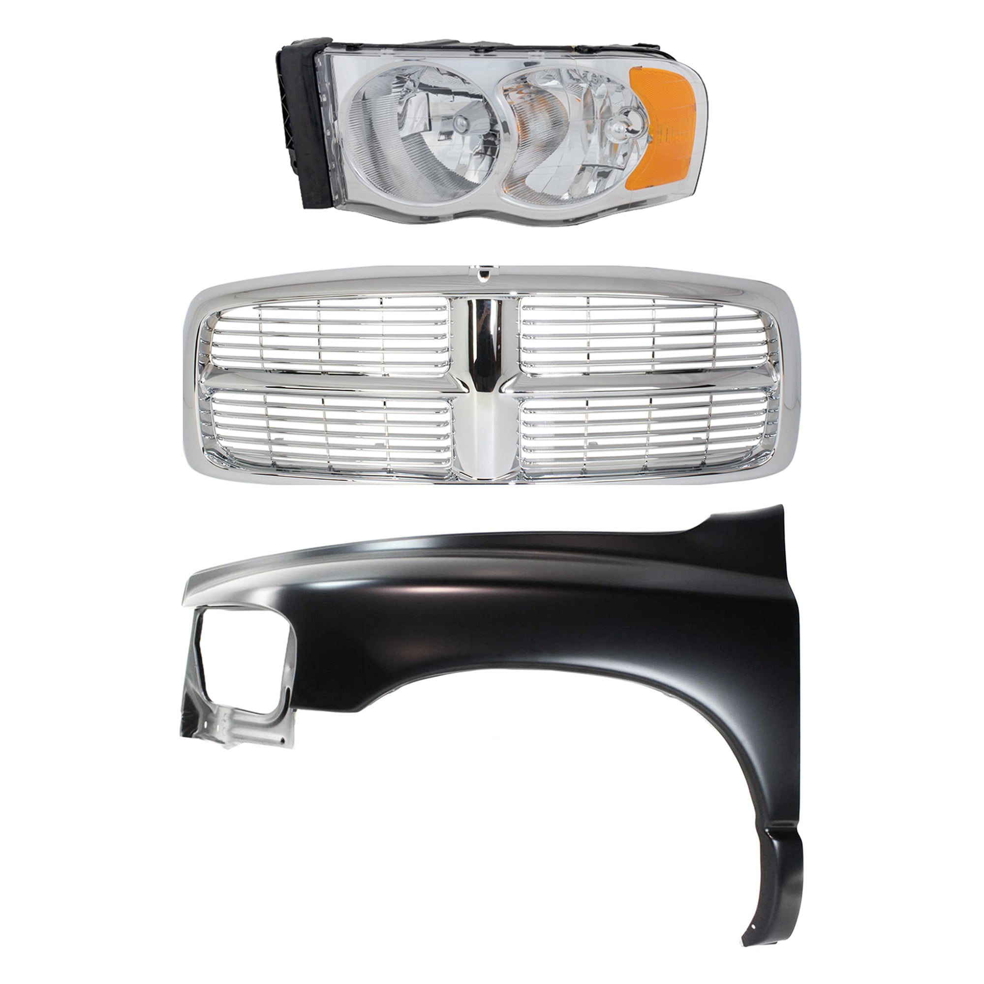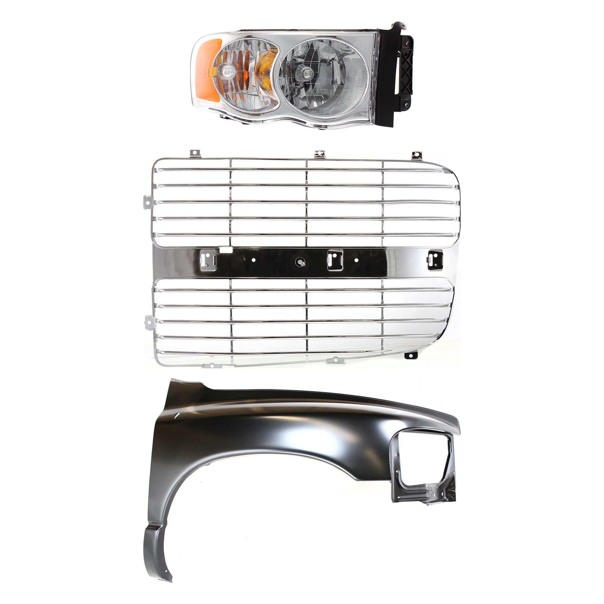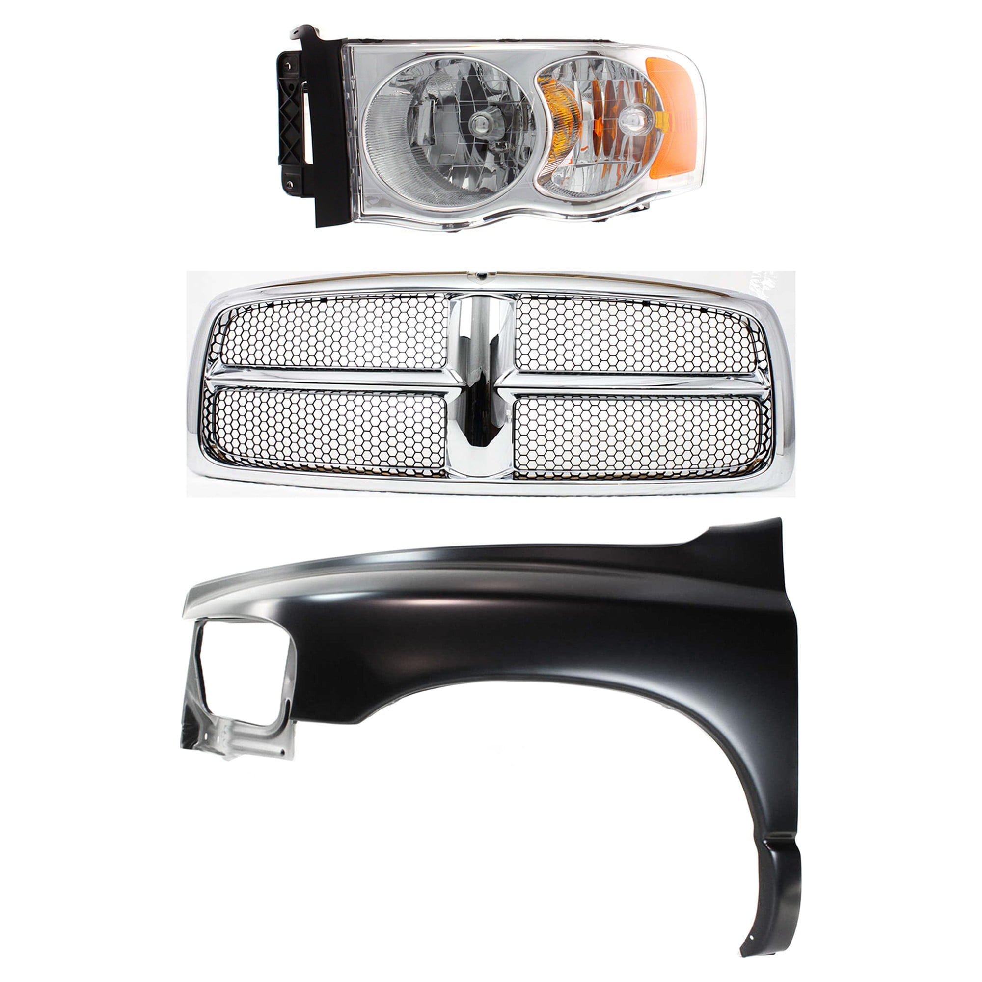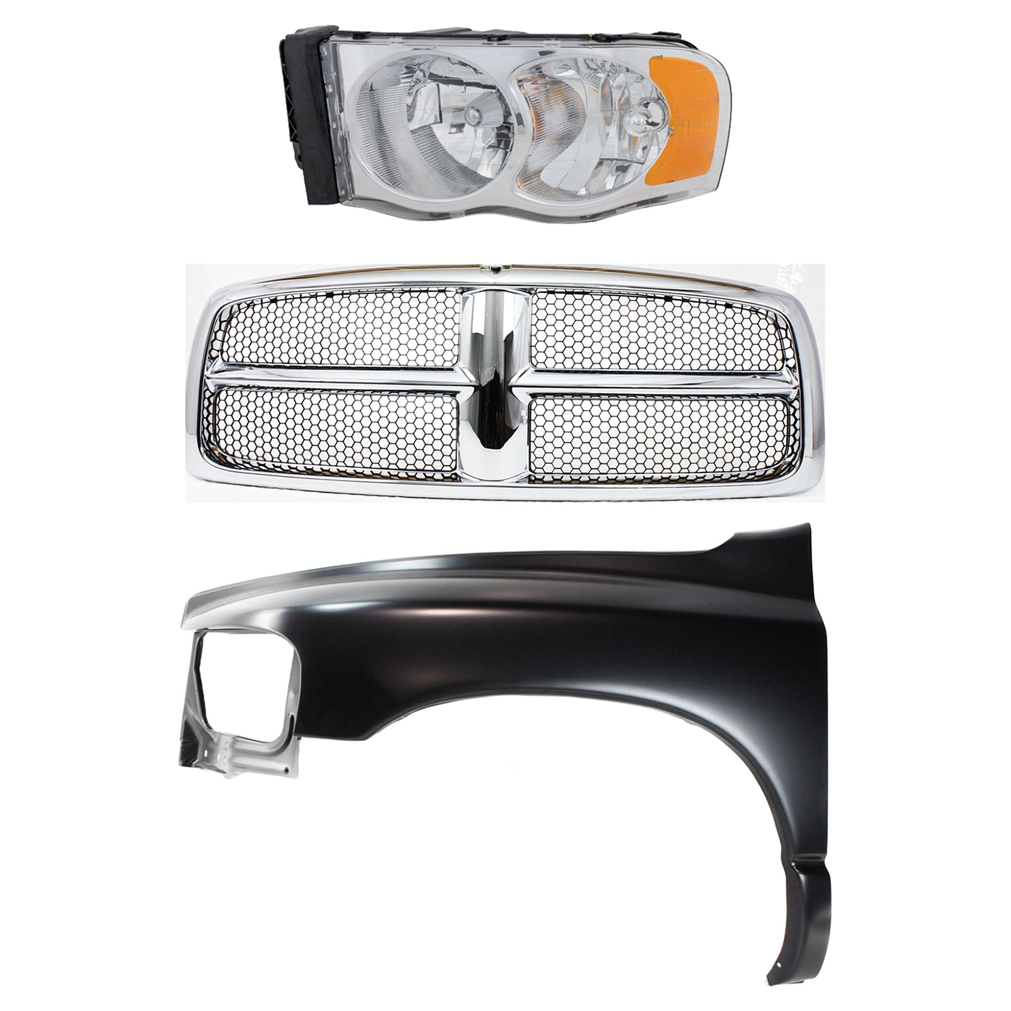 Front Fender for 2002-2005 Dodge Full Size Pickup, Left (Driver), 3-Piece Kit with Grille Assembly and Headlight Replacement