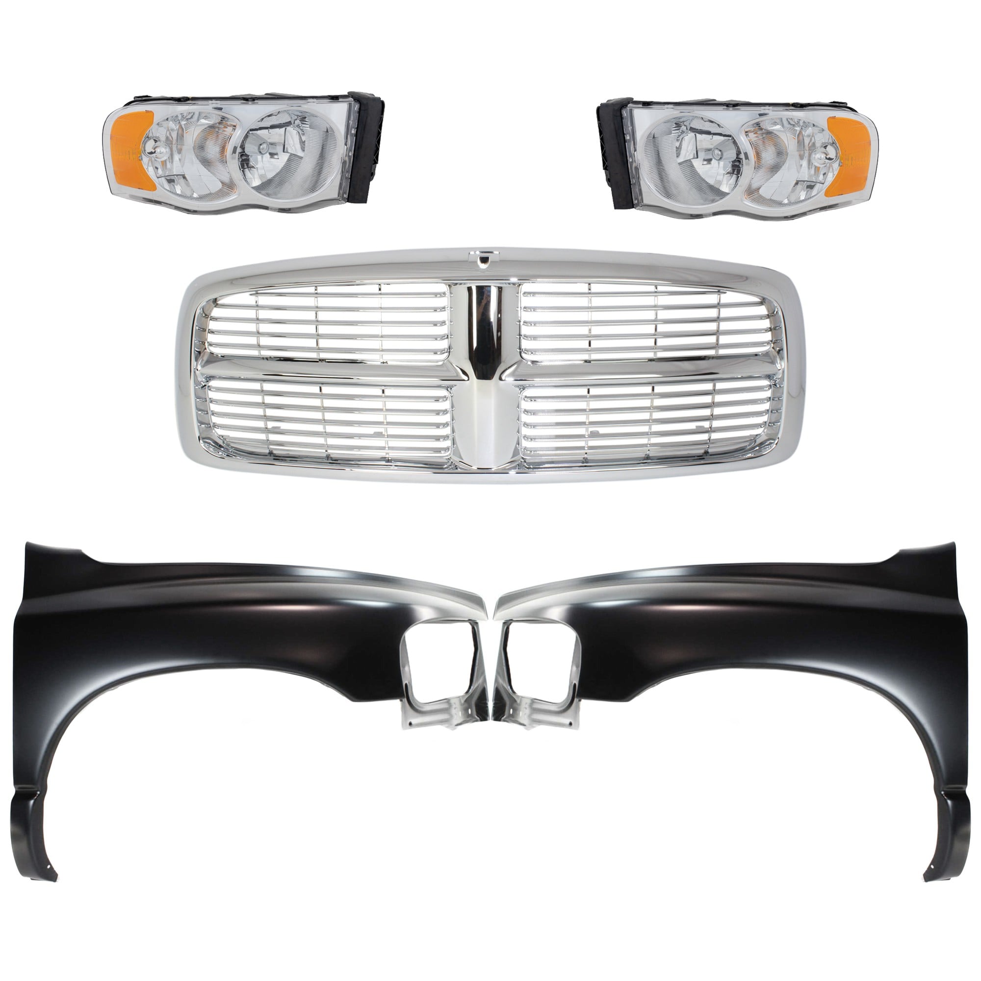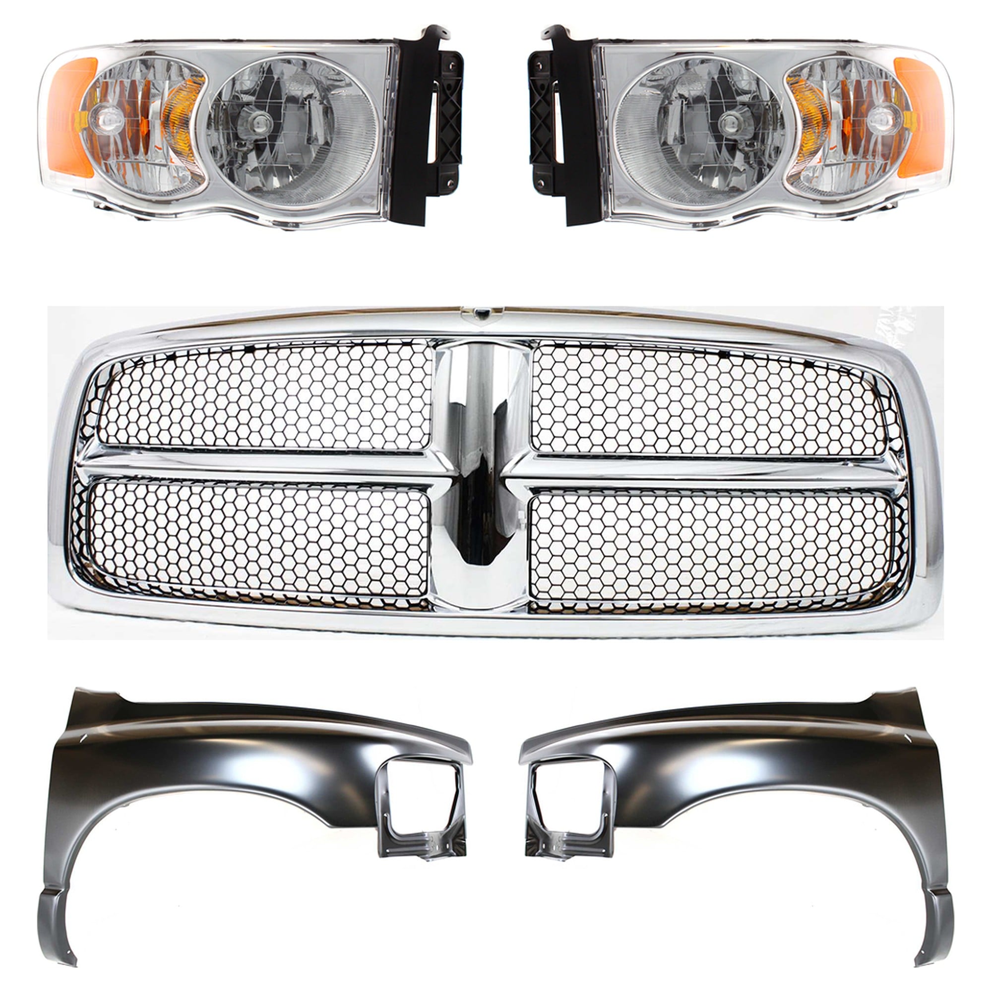Front Fender Right (Passenger) and Left (Driver) with Grille Assembly and Headlights for 2002-2005 Dodge Full Size Pickup, 5-Piece Kit, Replacement