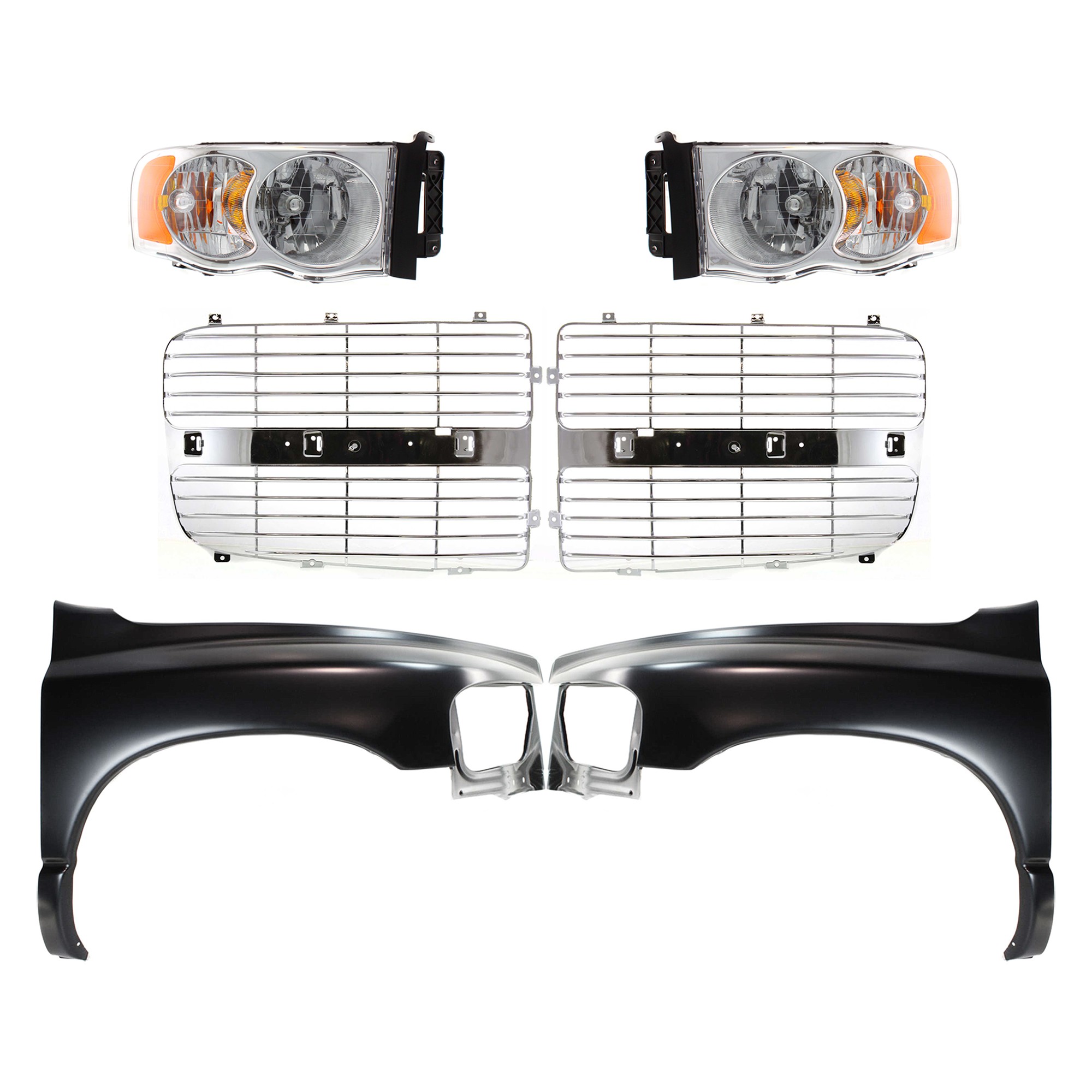 Front Fender, Right (Passenger) and Left (Driver), for 2002-2005 Dodge Full Size Pickup, 6-Piece Kit with Grille Inserts and Headlights, Replacement