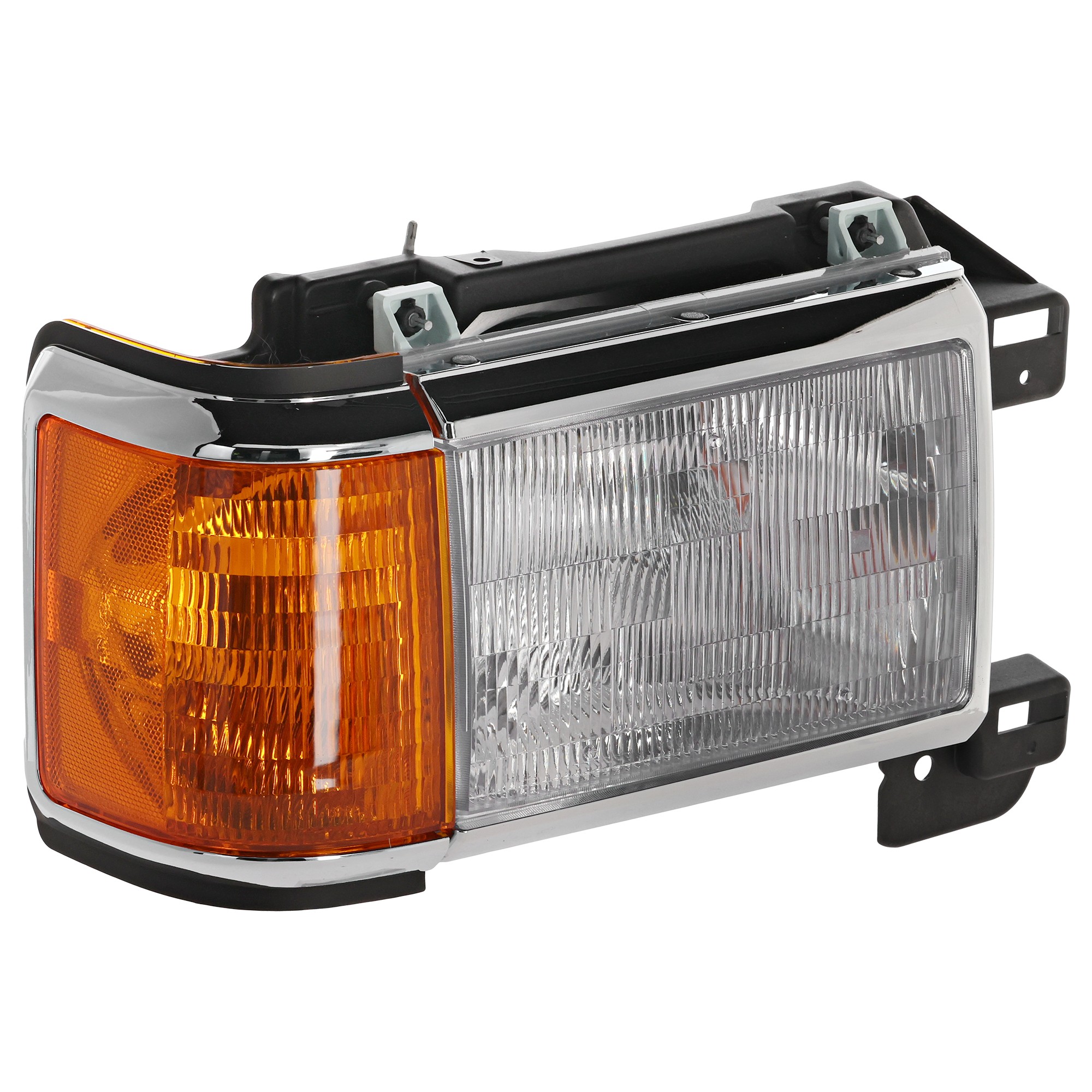 Fits Years: 1987 1988 1989 1990 1991 Headlight Assembly for Ford F-Series 1987-1991, Right (Passenger), Halogen, with Side Marker Light, with Chrome Trim, Replacement Models: F-150, F-250, F-350.