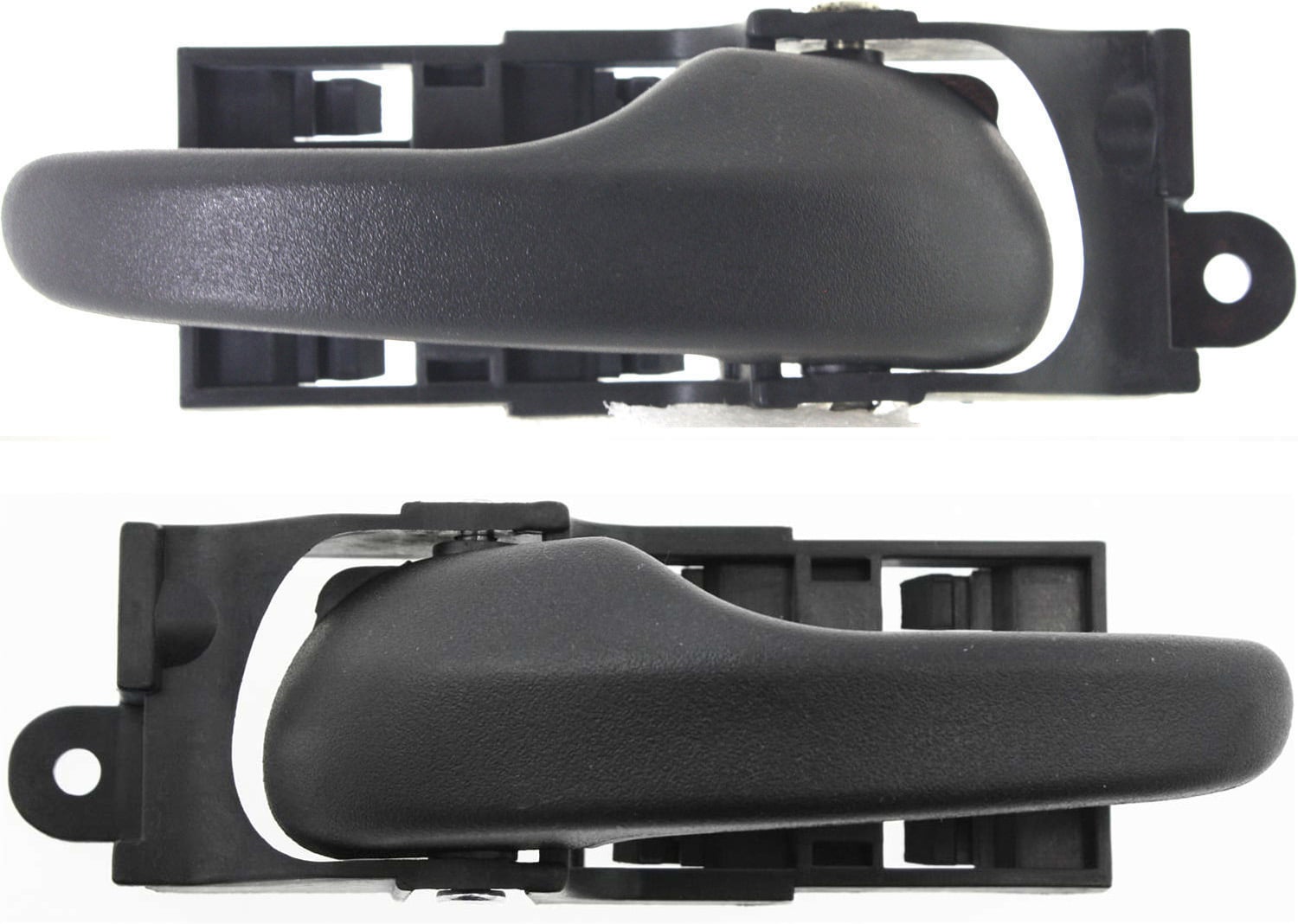 This pair of front exterior door handles is textured black and includes a plastic connector.