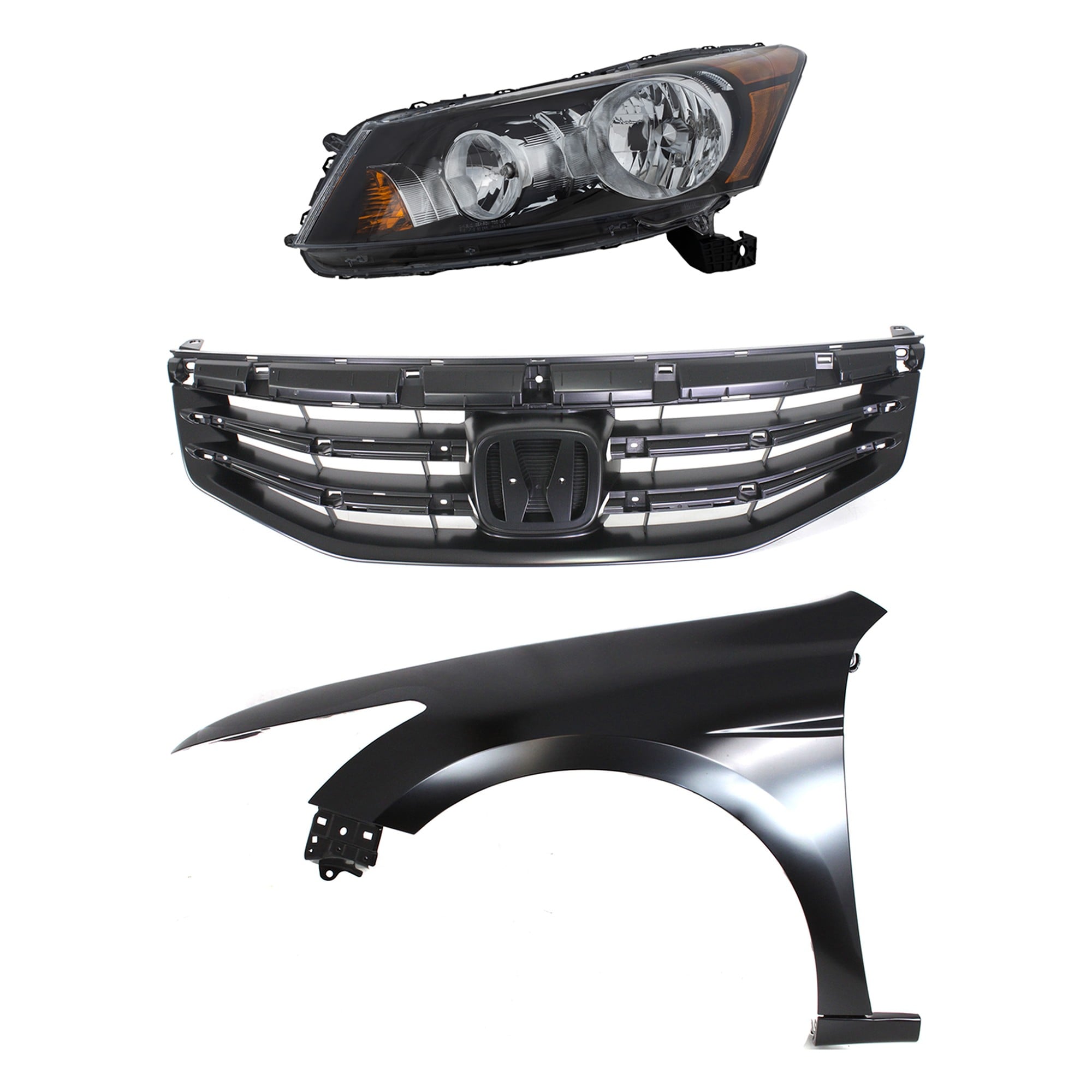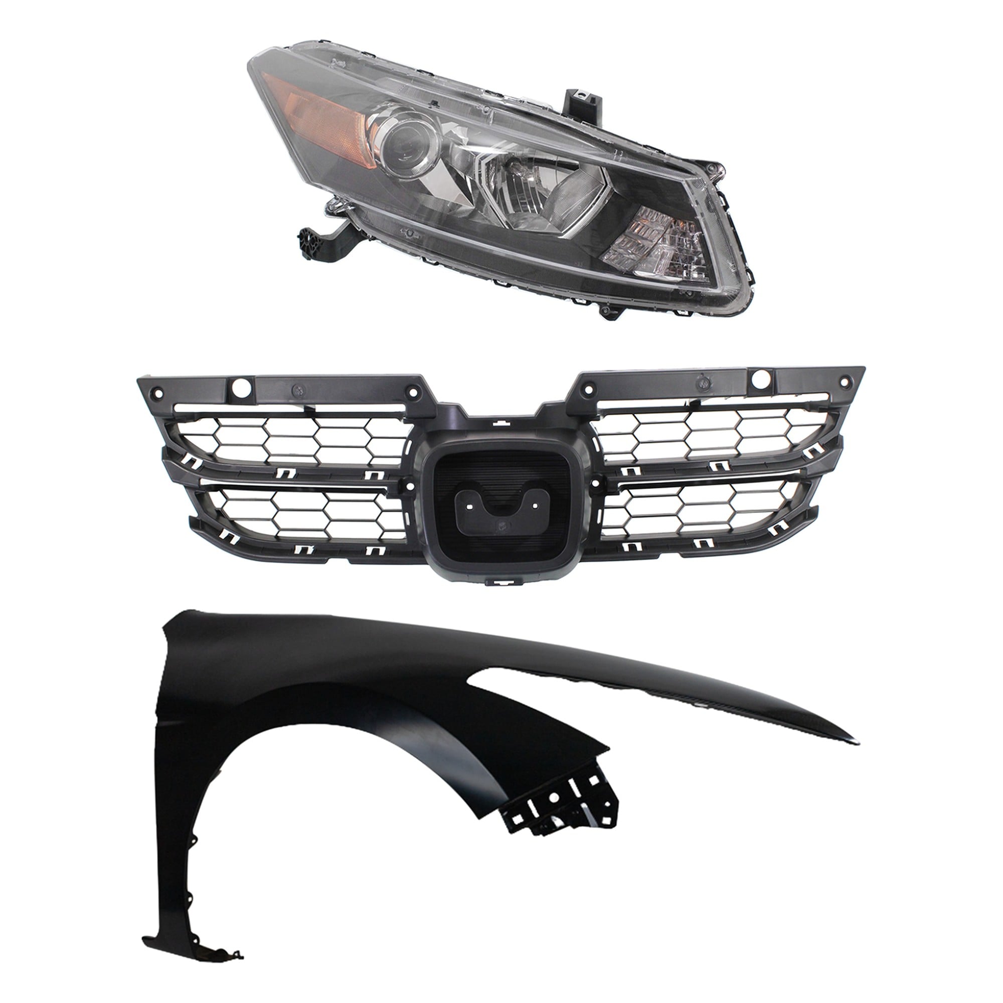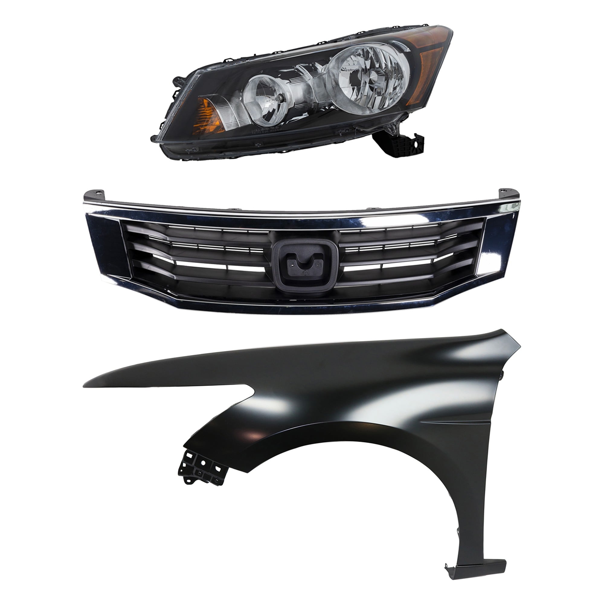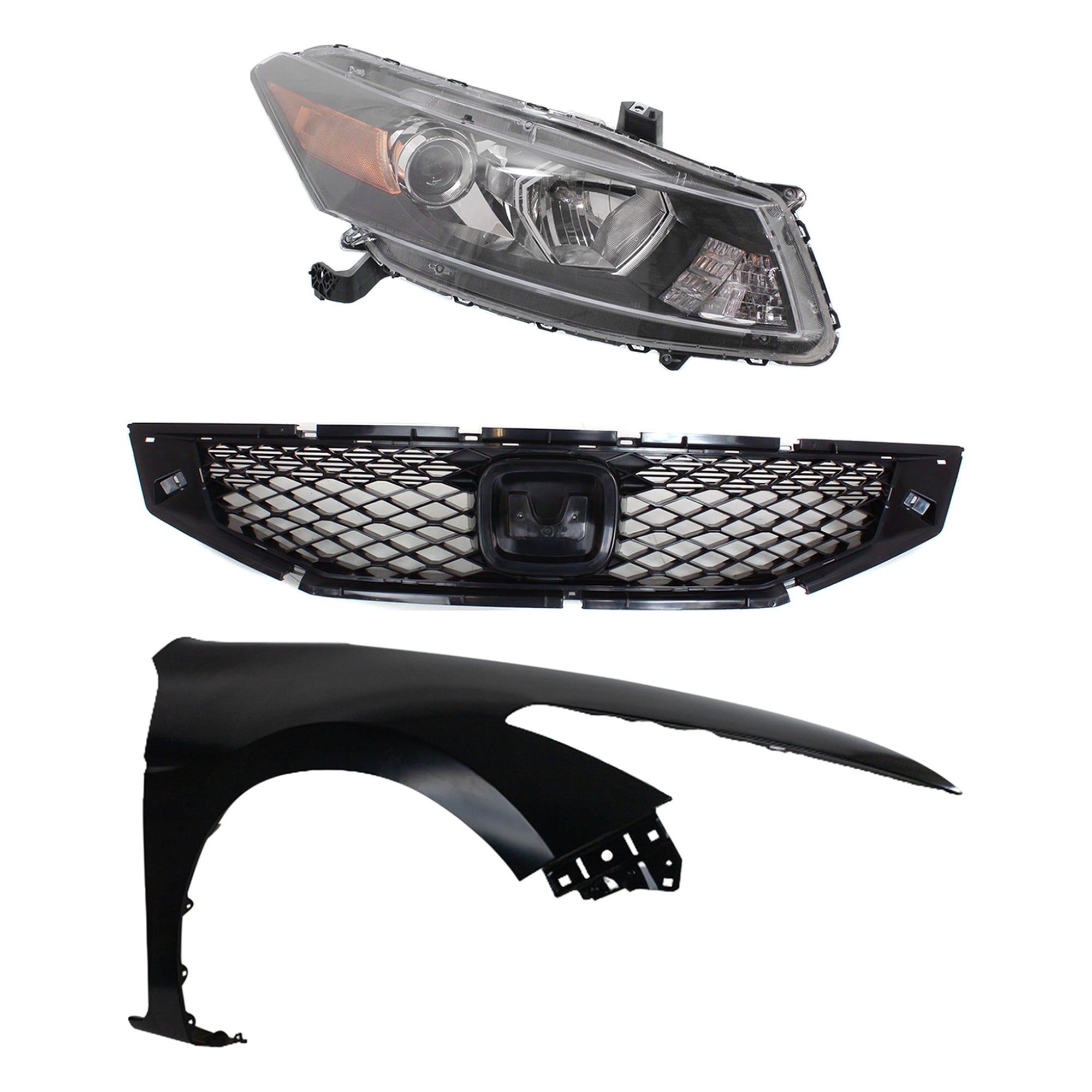 Headlight Assembly Kit for 2008-2010 Honda Accord, Right (Passenger) Side, Halogen, 3-Piece Kit, with Fender and Grille - (CAPA) Replacement