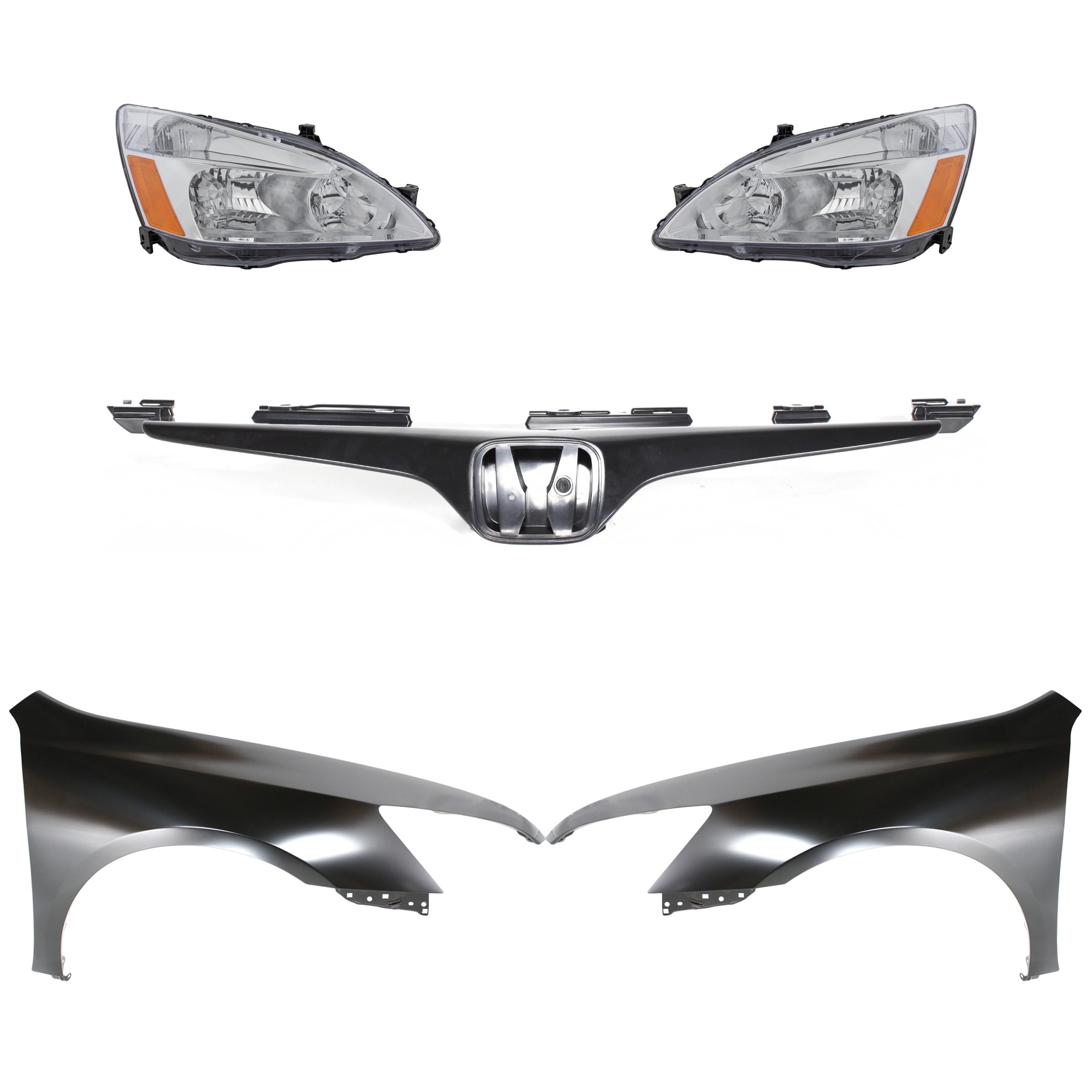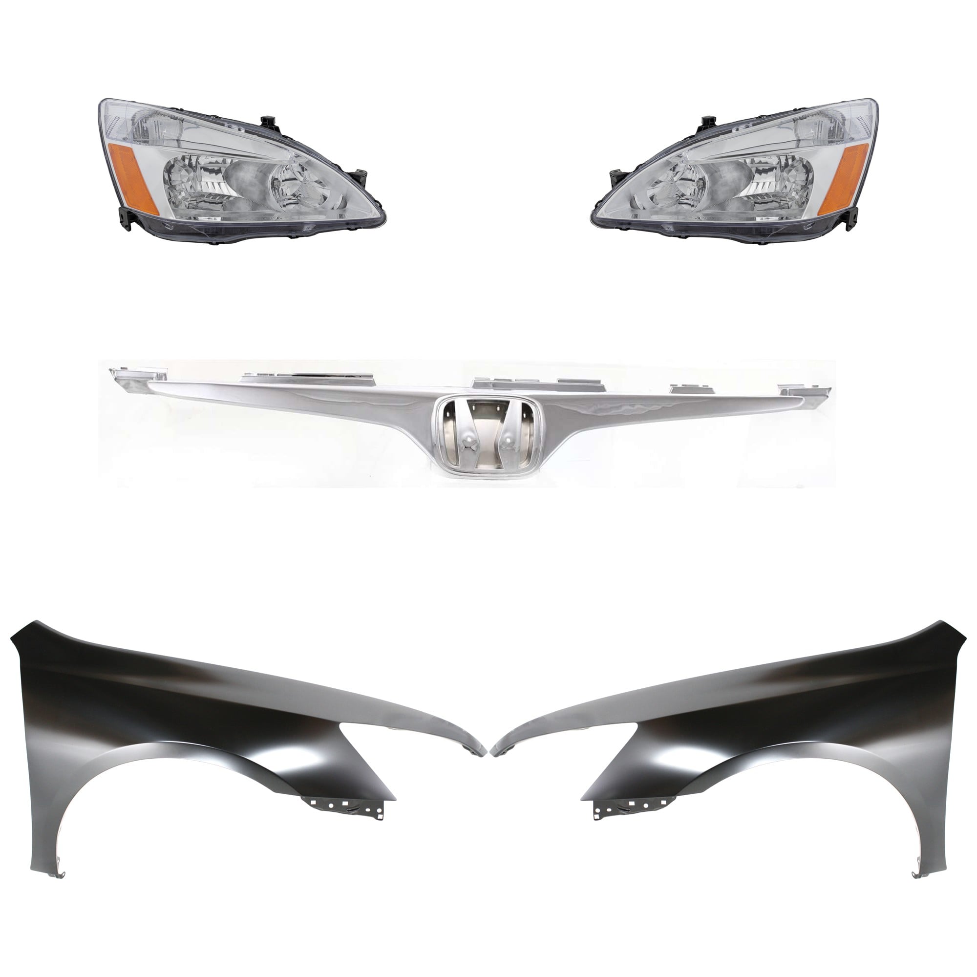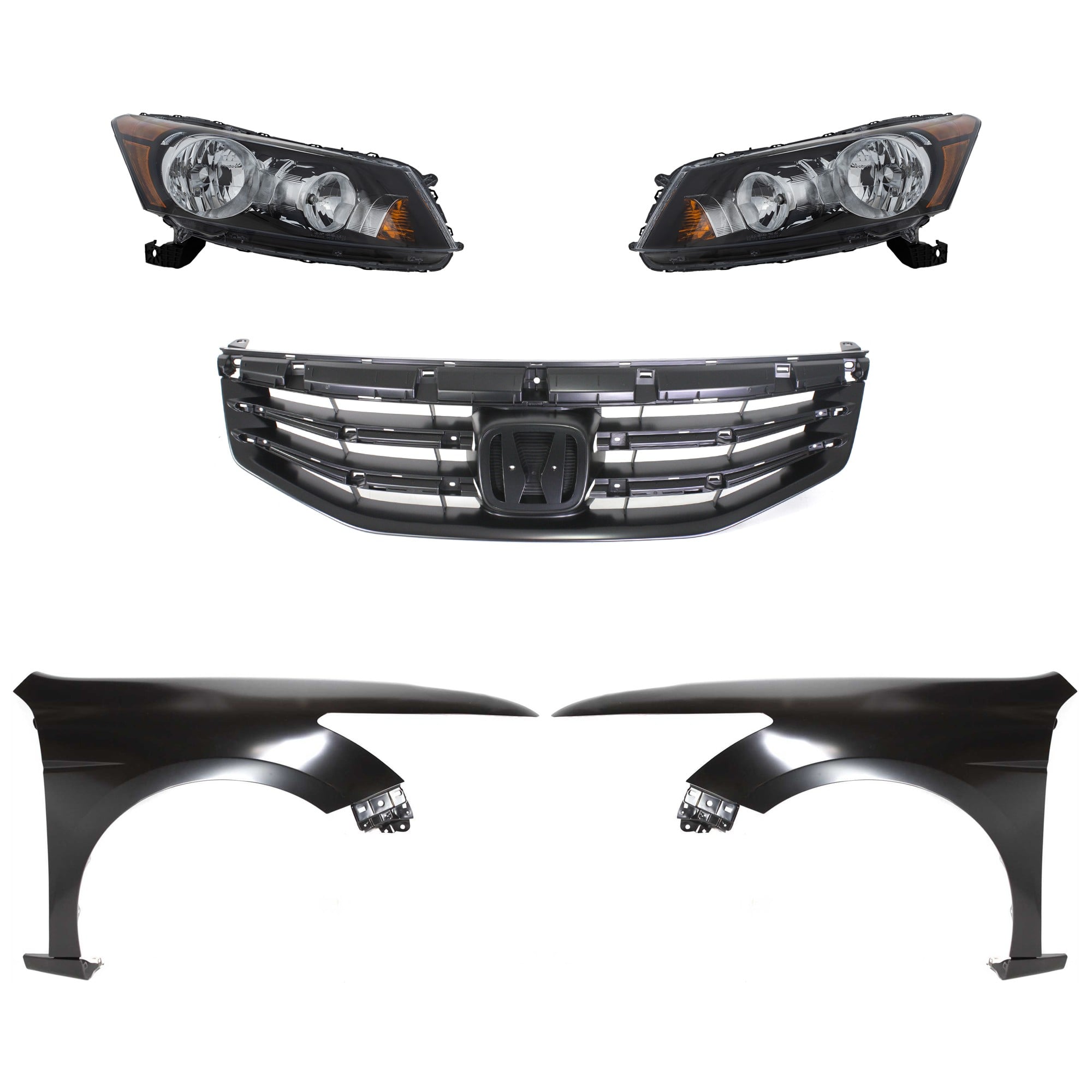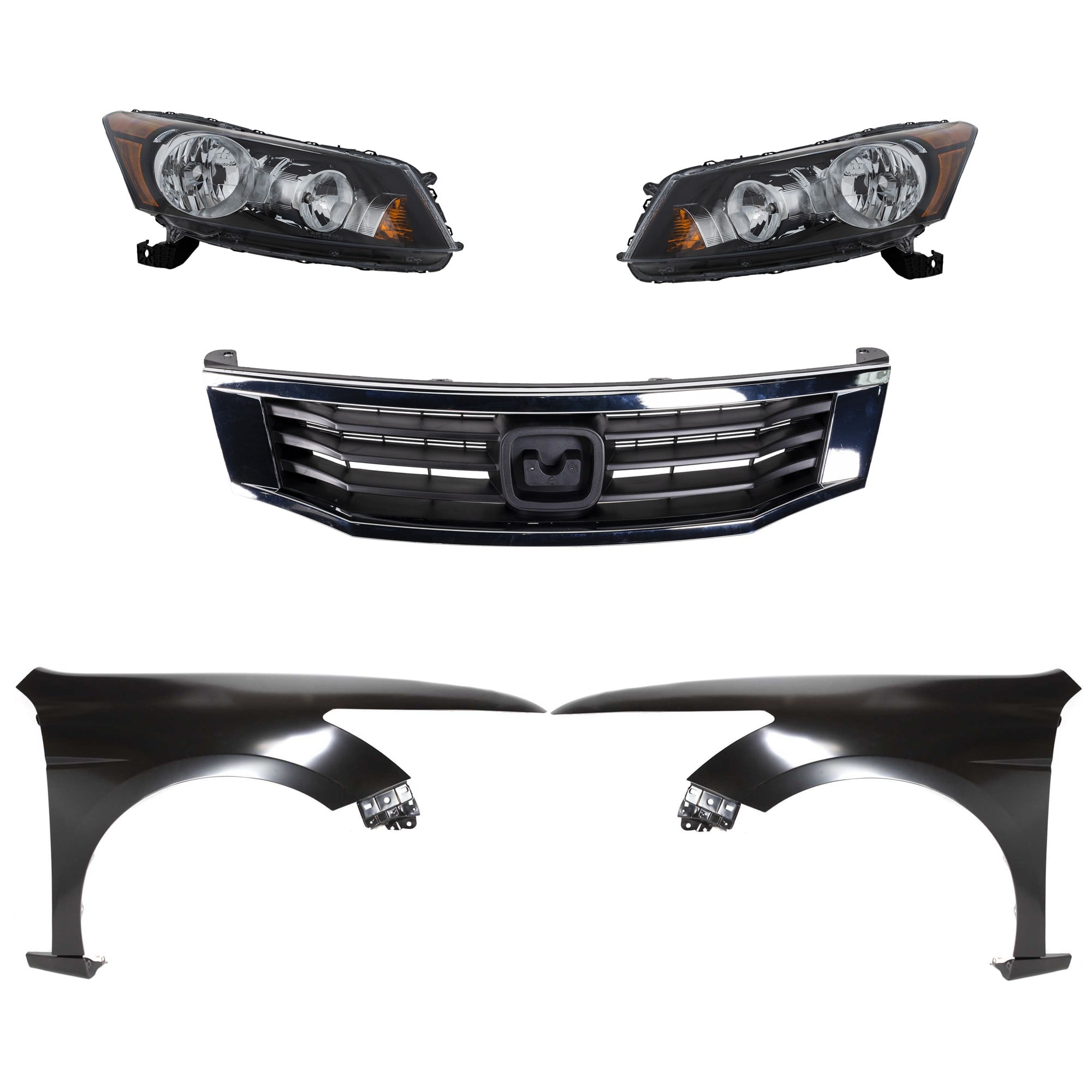 Headlight Assembly Kit for 2008-2010 Honda Accord, Right (Passenger) and Left (Driver), Halogen, 5-Piece Kit with Fenders and Grille - (CAPA) Replacement
