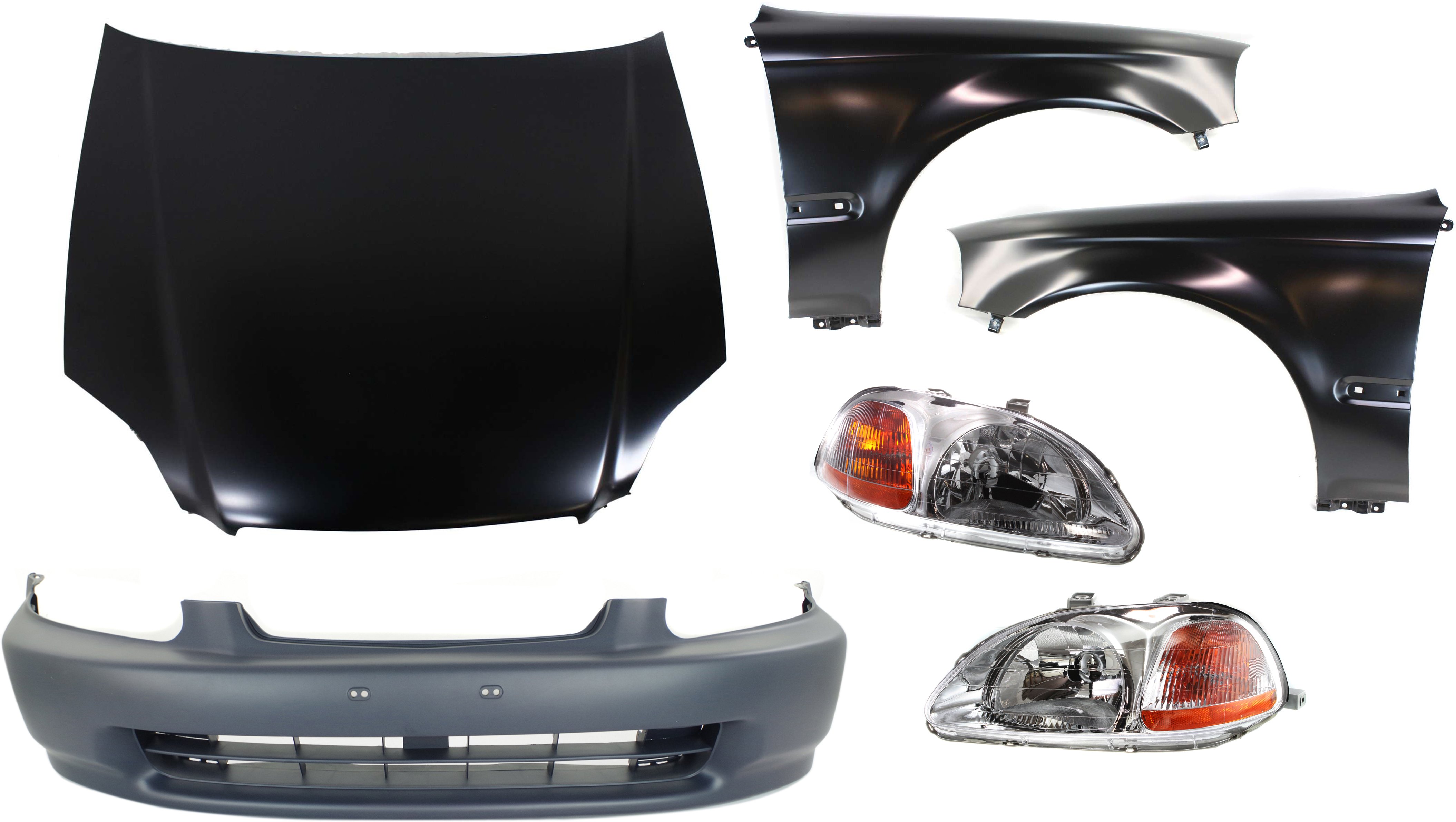 Hood Panel, Bumper Cover, Fenders, and Headlights Kit for 1996-1998 Honda Civic, 6-Piece Replacement Set