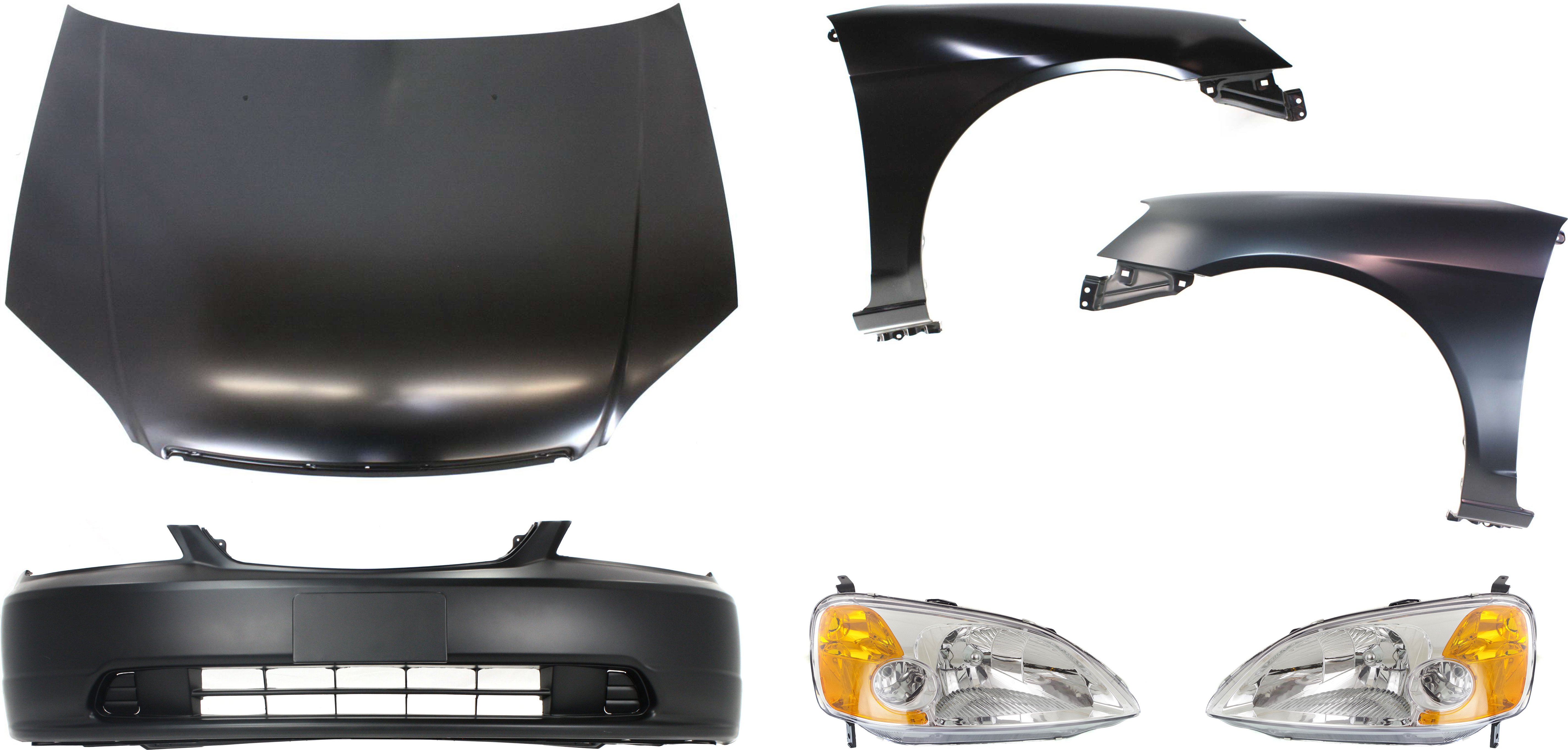 6-Piece Kit of Hood Panel, Bumper Cover, Fenders and Headlights for 2001-2003 Honda Civic Coupe, Auto Part Replacement