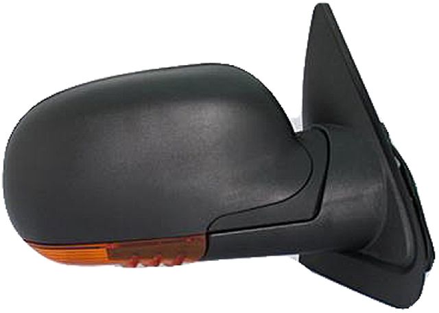 This mirror is power adjustable. It has a black textured finish and a black cover. This mirror does not include a turn signal lamp.