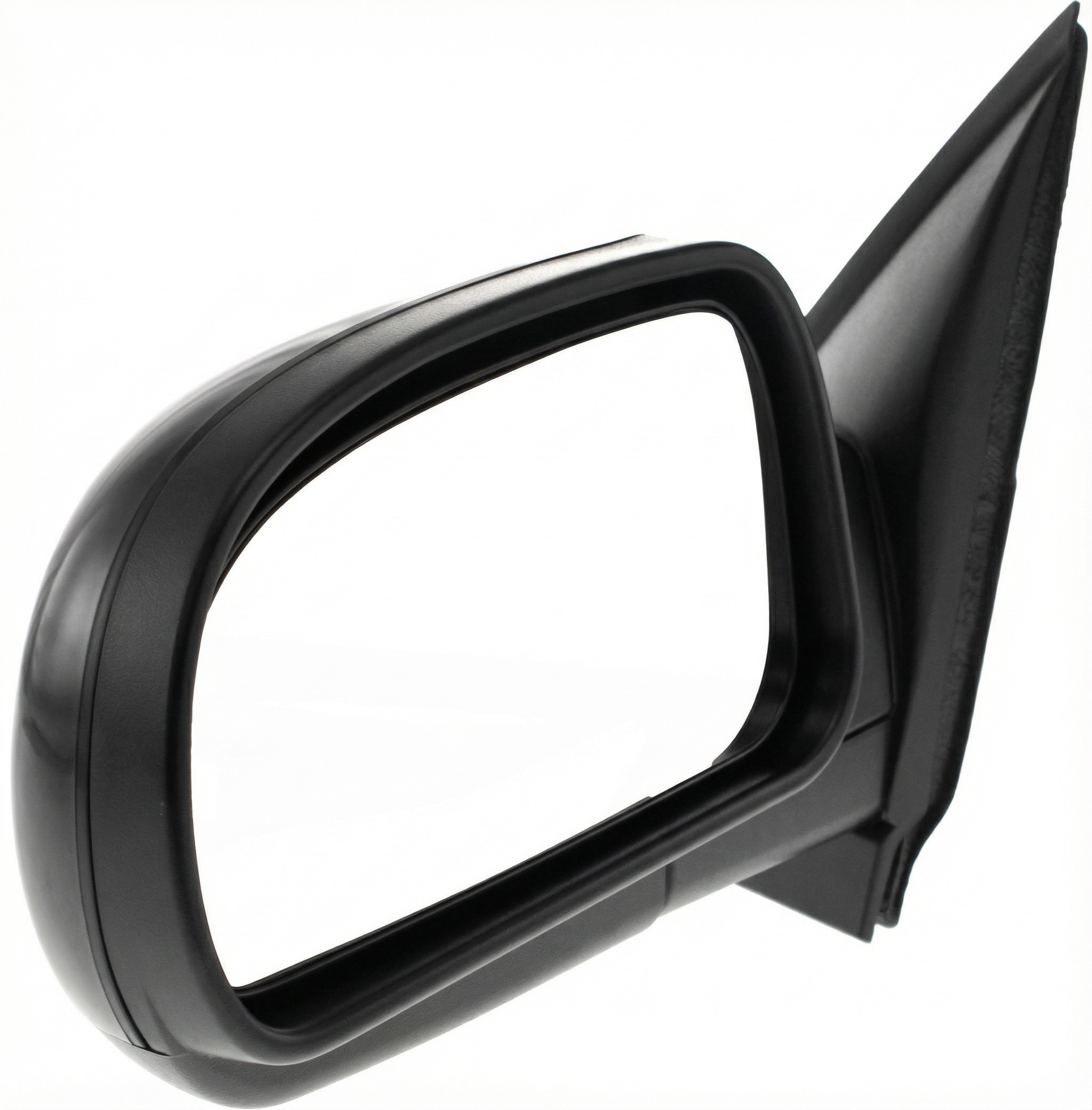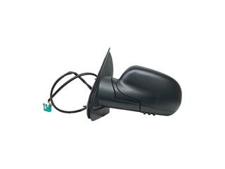 It is a power side view mirror with a black textured finish.