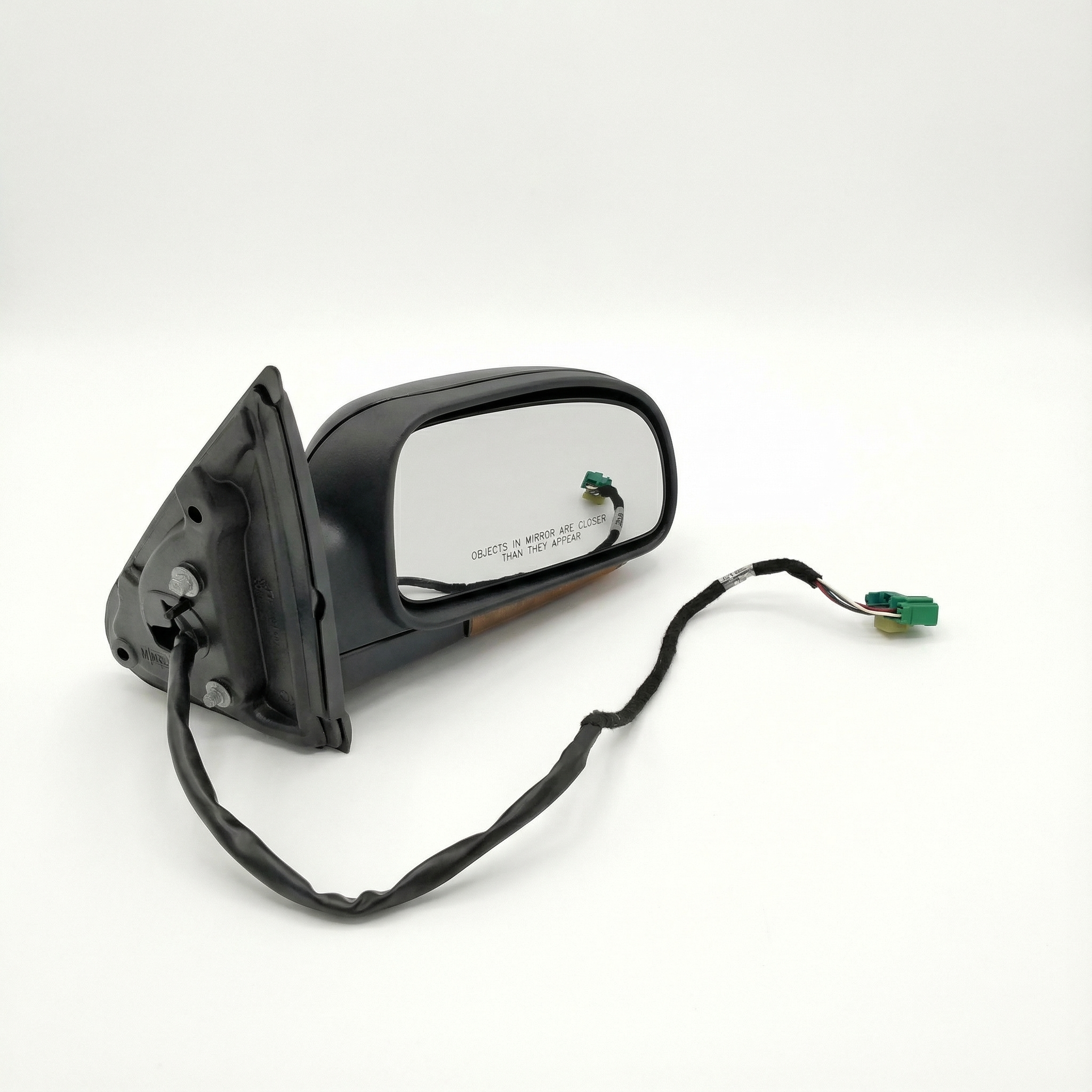 This side view mirror has power controls and is designed for 4-door models. It features a clear lens with an amber turn signal bulb. There is no damage to this part.