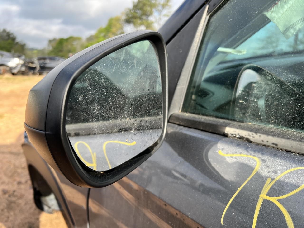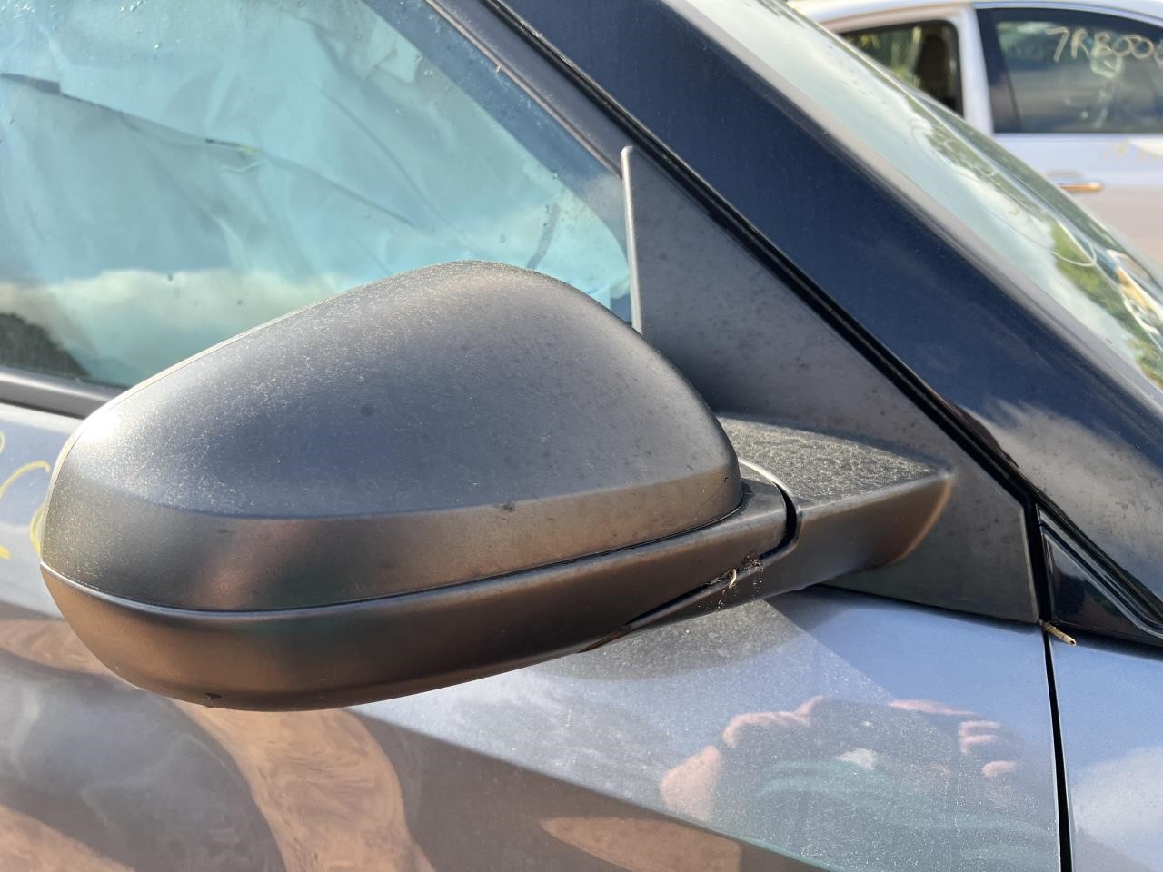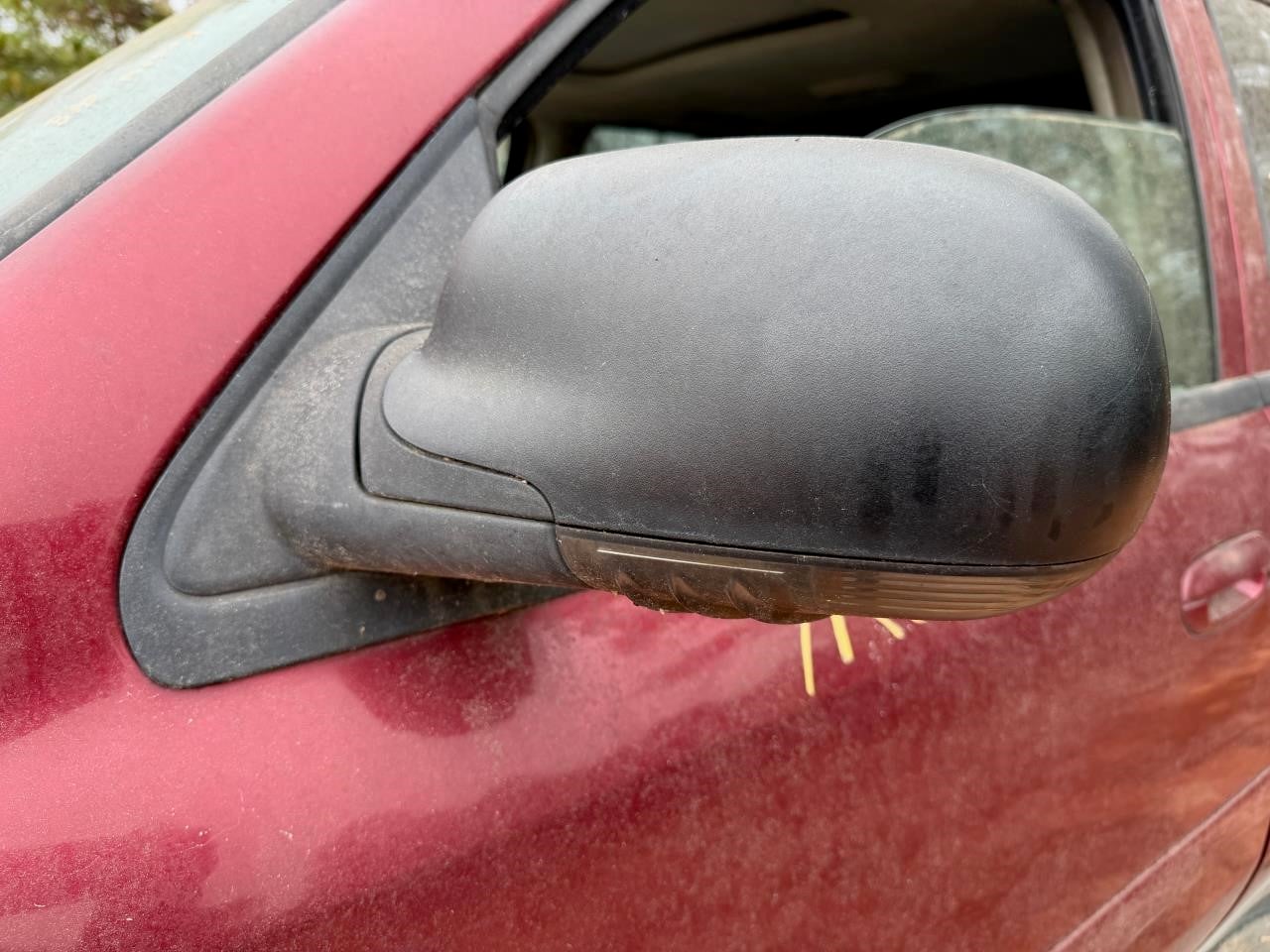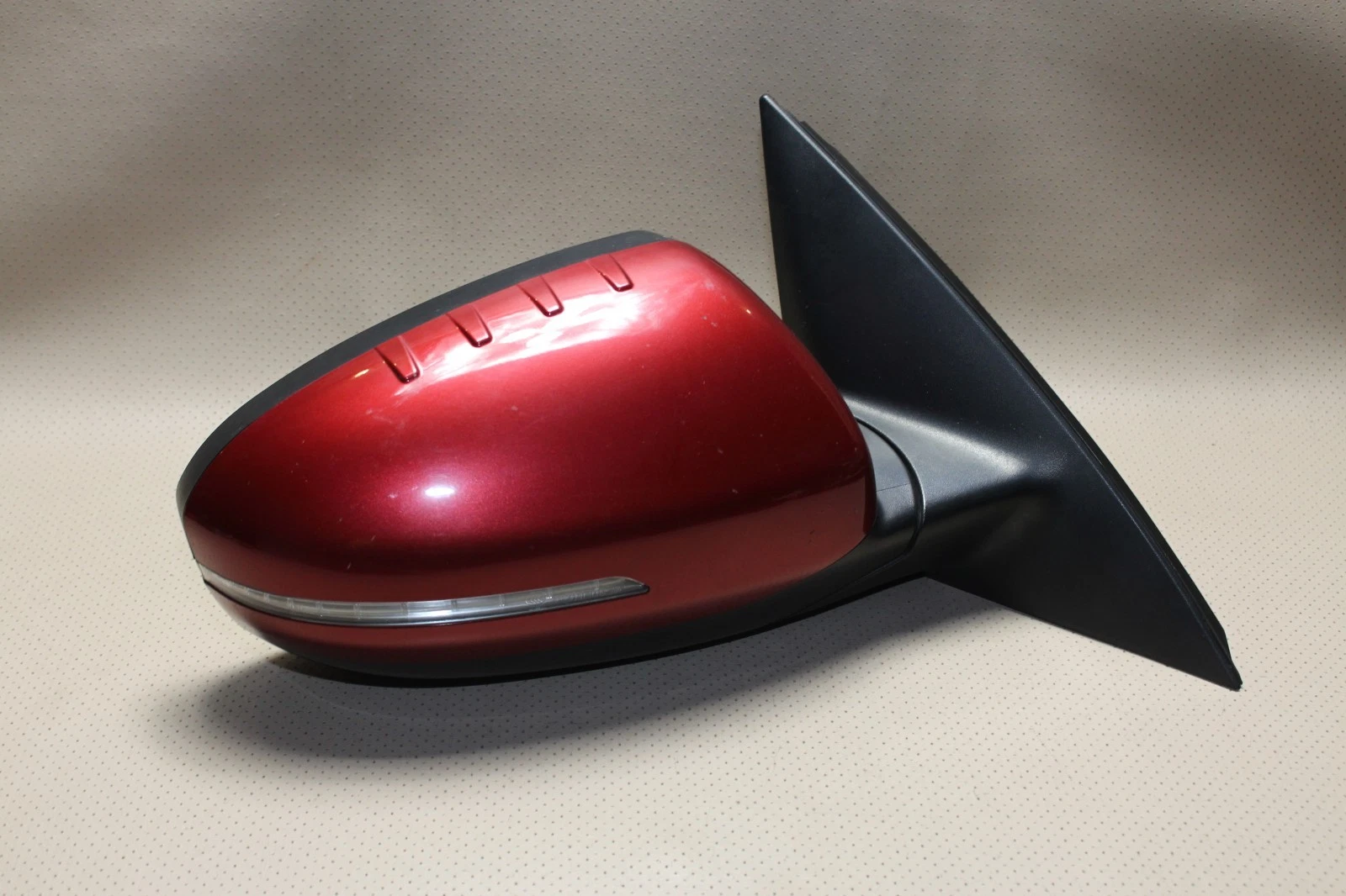 This side view mirror is for a 4-door vehicle. It is a power mirror with a textured finish. Please note that the part has a moderate scratch and some fading.