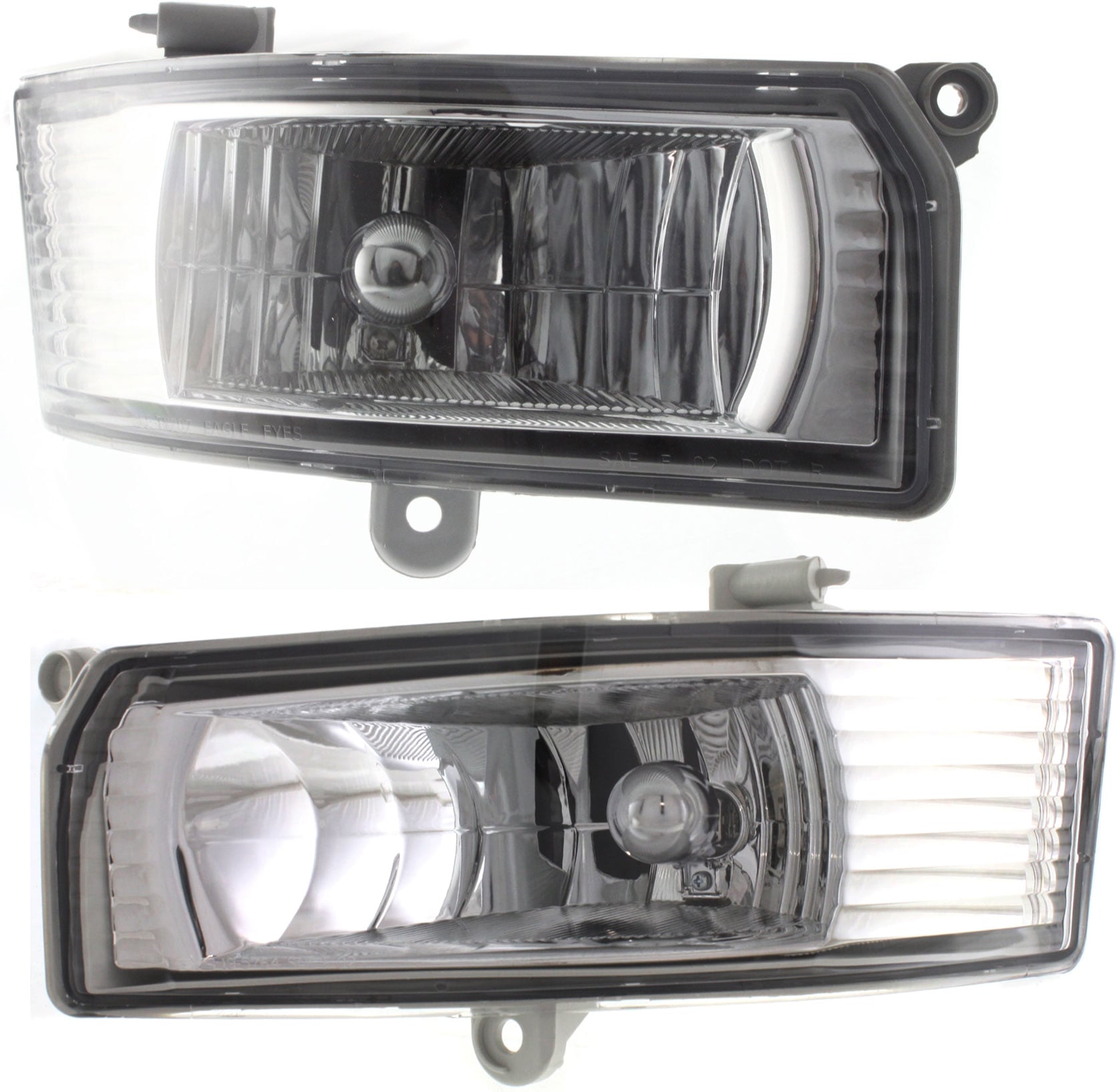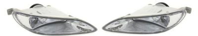 This is a 3-piece kit assembly. It includes the Right (Passenger) and Left (Driver) fog lamps, featuring a Halogen bulb type and a Clear Lens. The kit also comes with Bumper Trims.