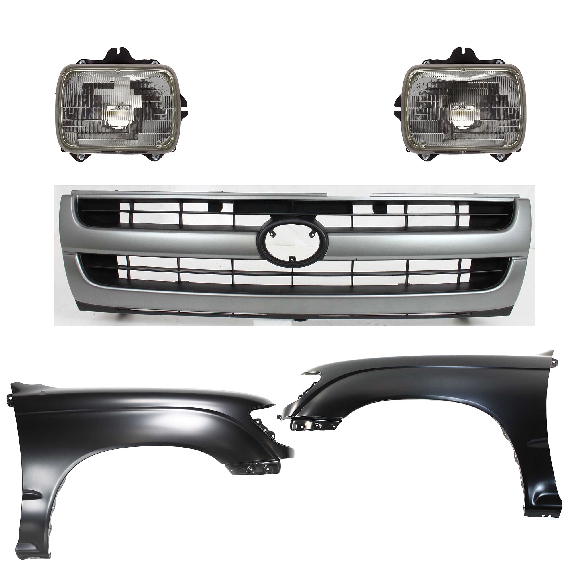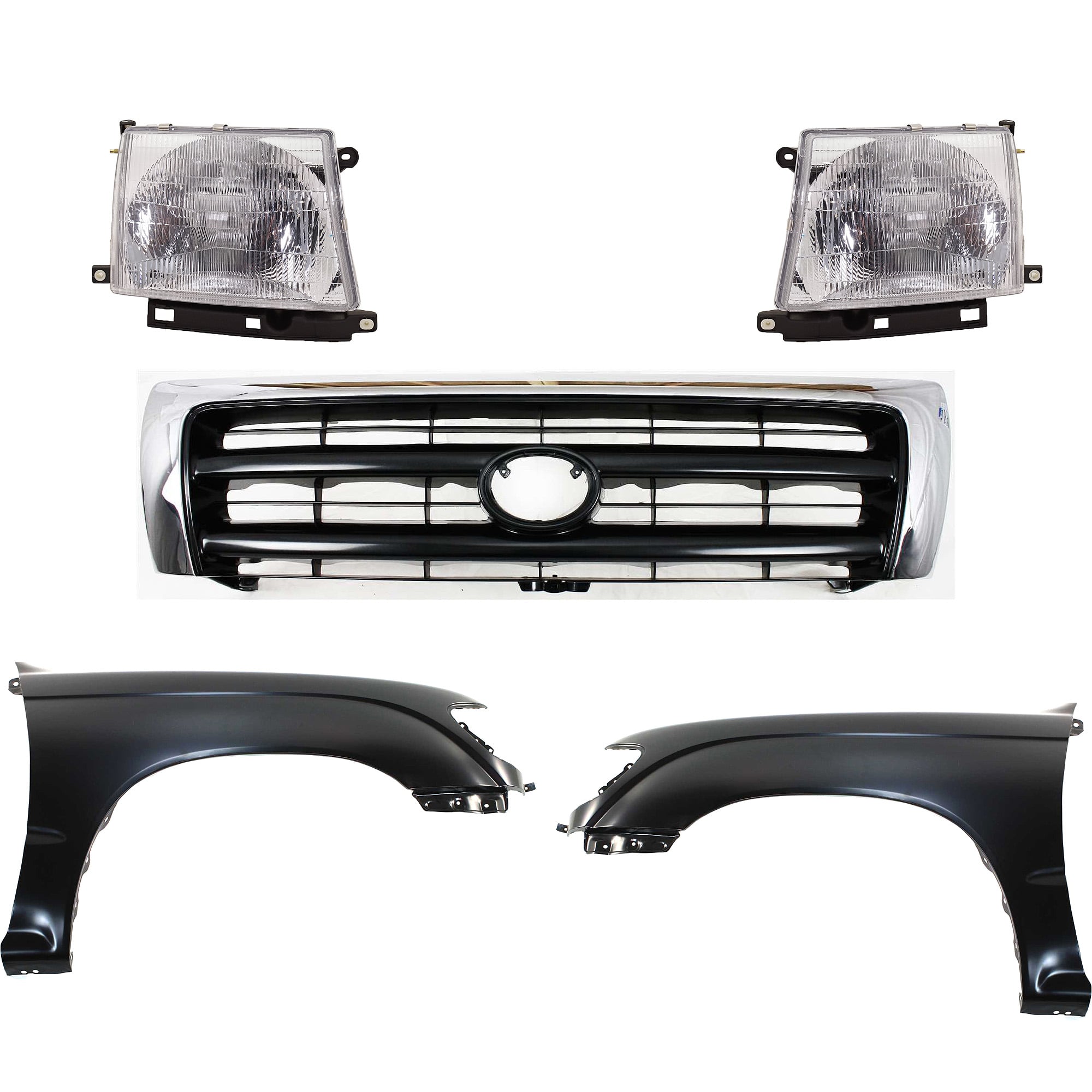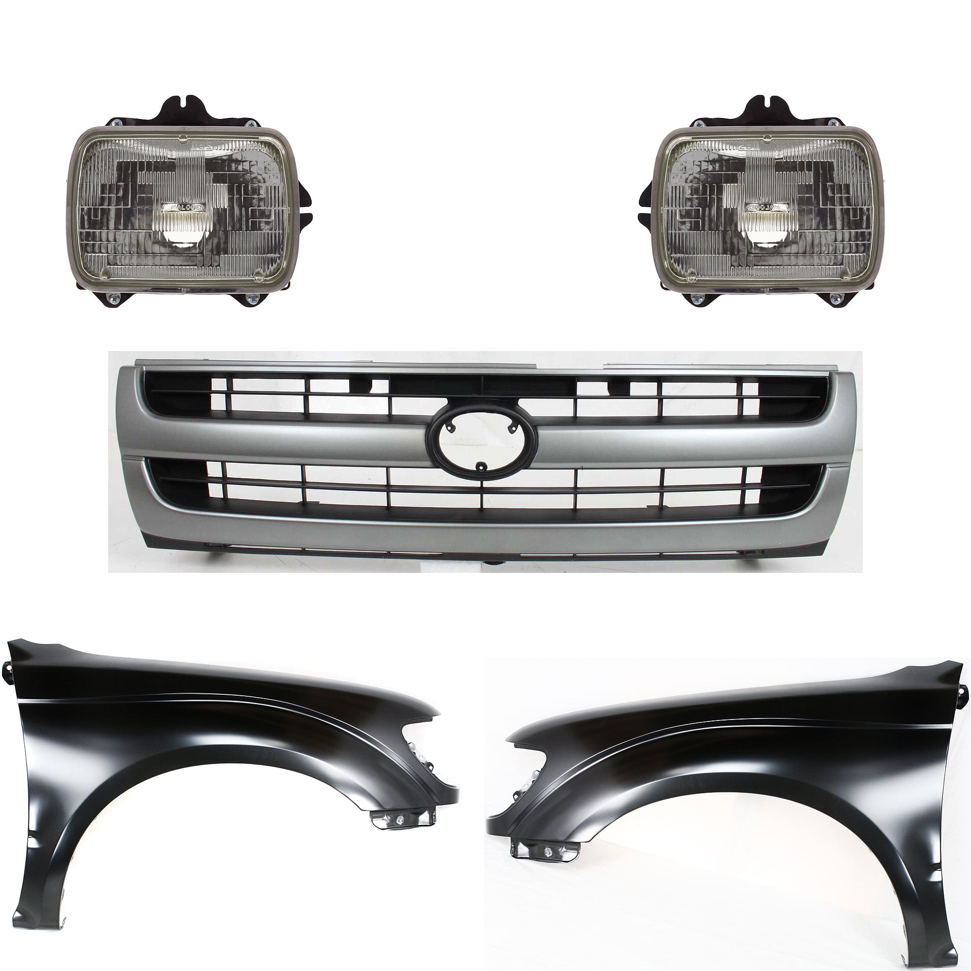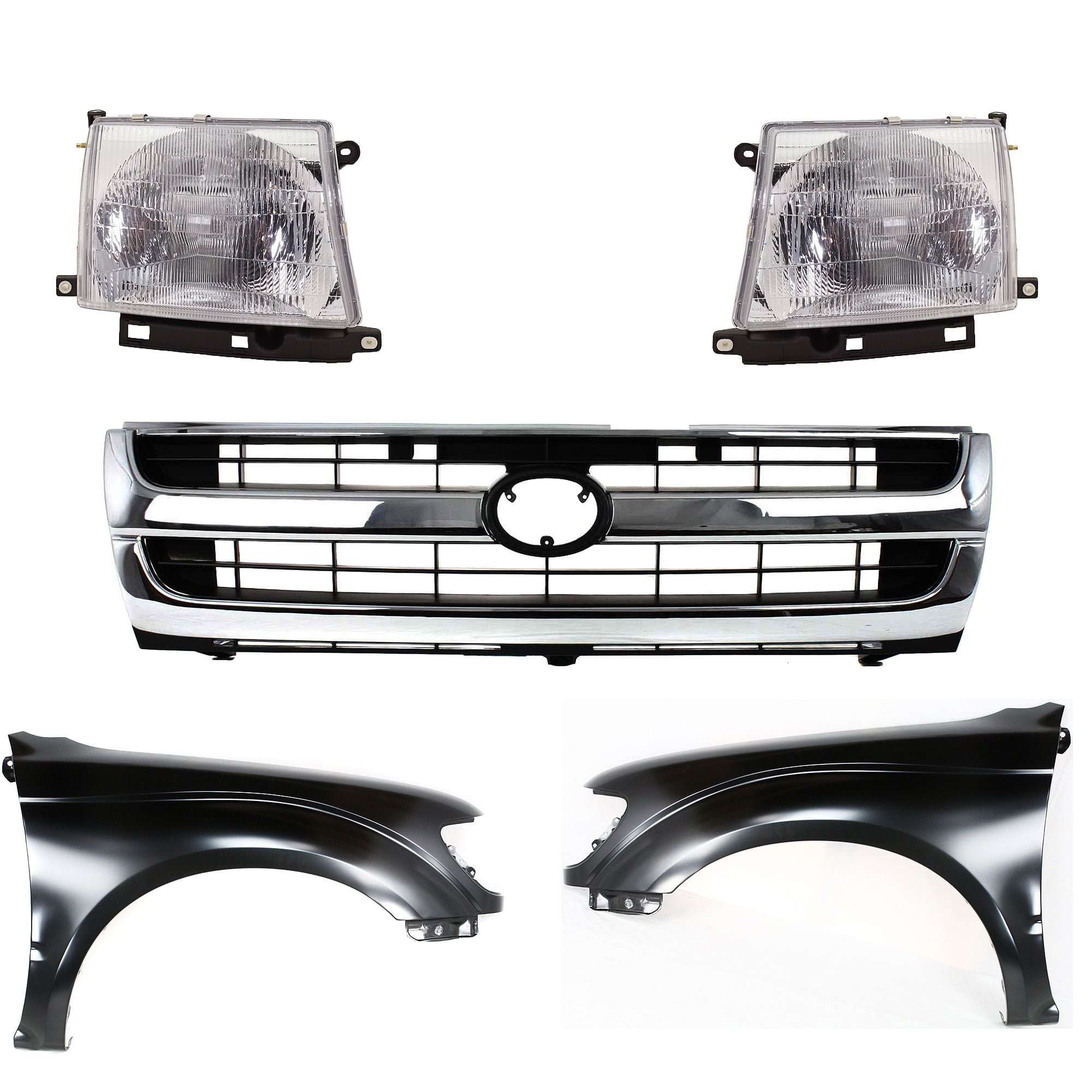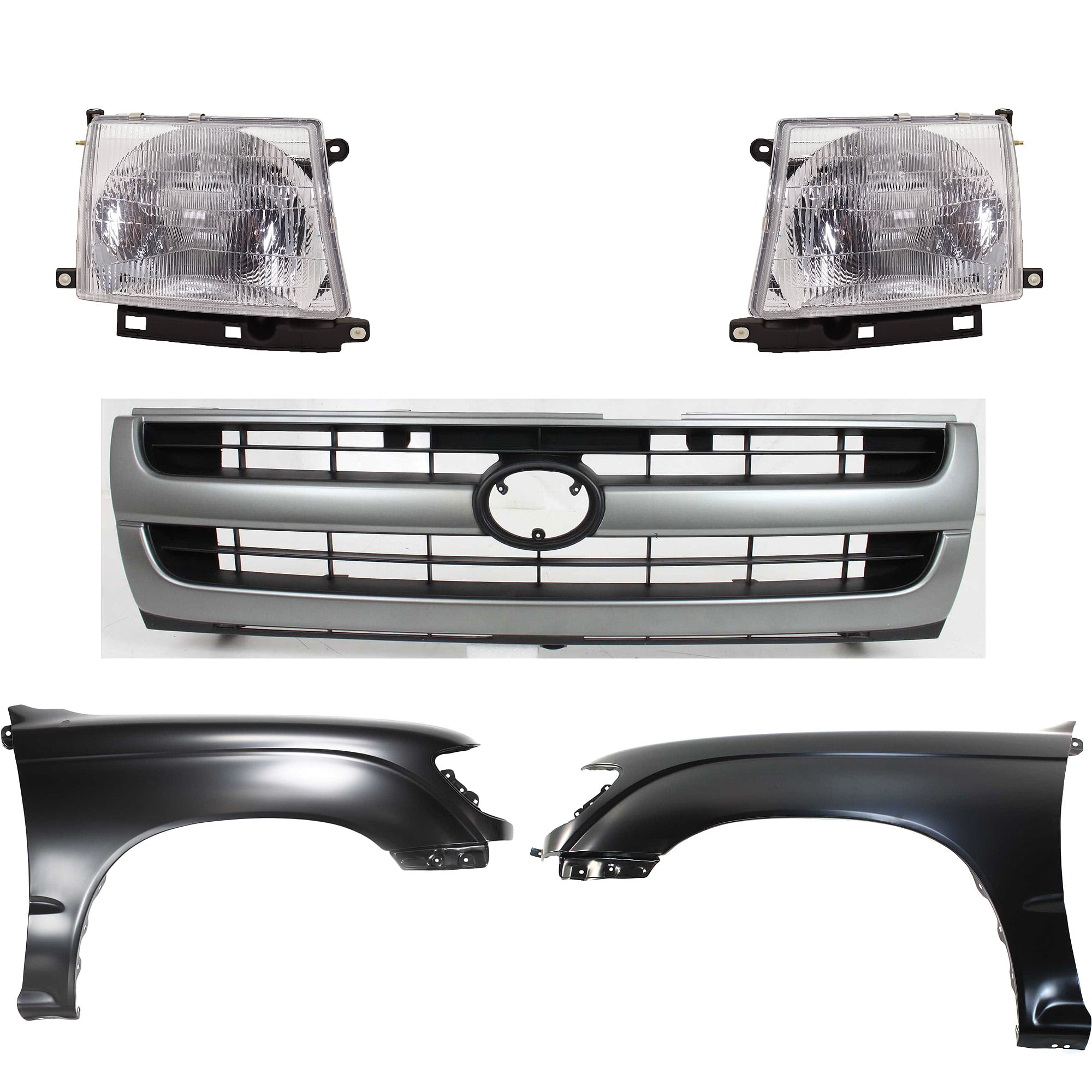Front Fender Kit for Toyota Tacoma 1997-2000 with Right (Passenger) and Left (Driver) Sides, Primed (Ready to Paint), 5-Piece Set, includes Grille and Headlights, Replacement