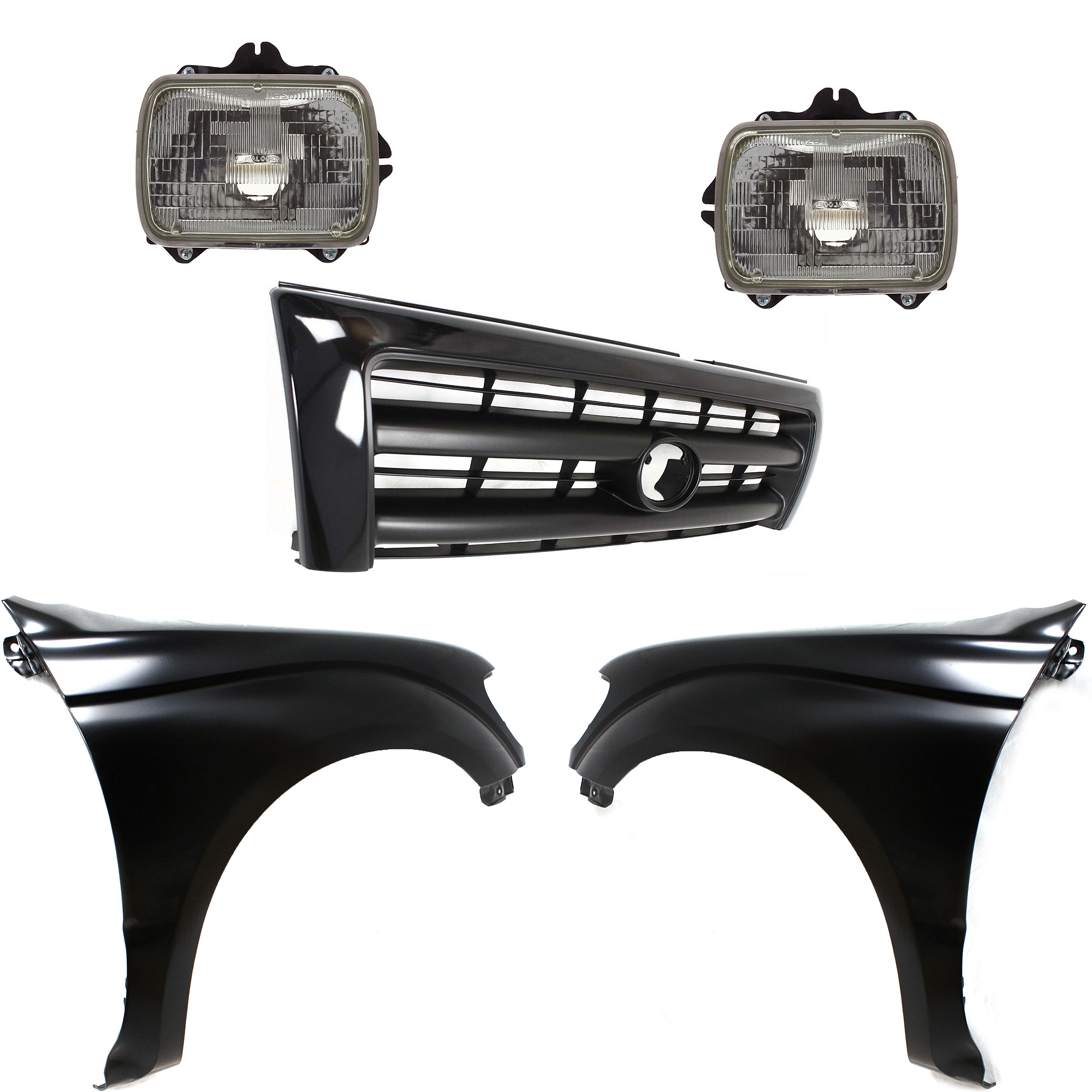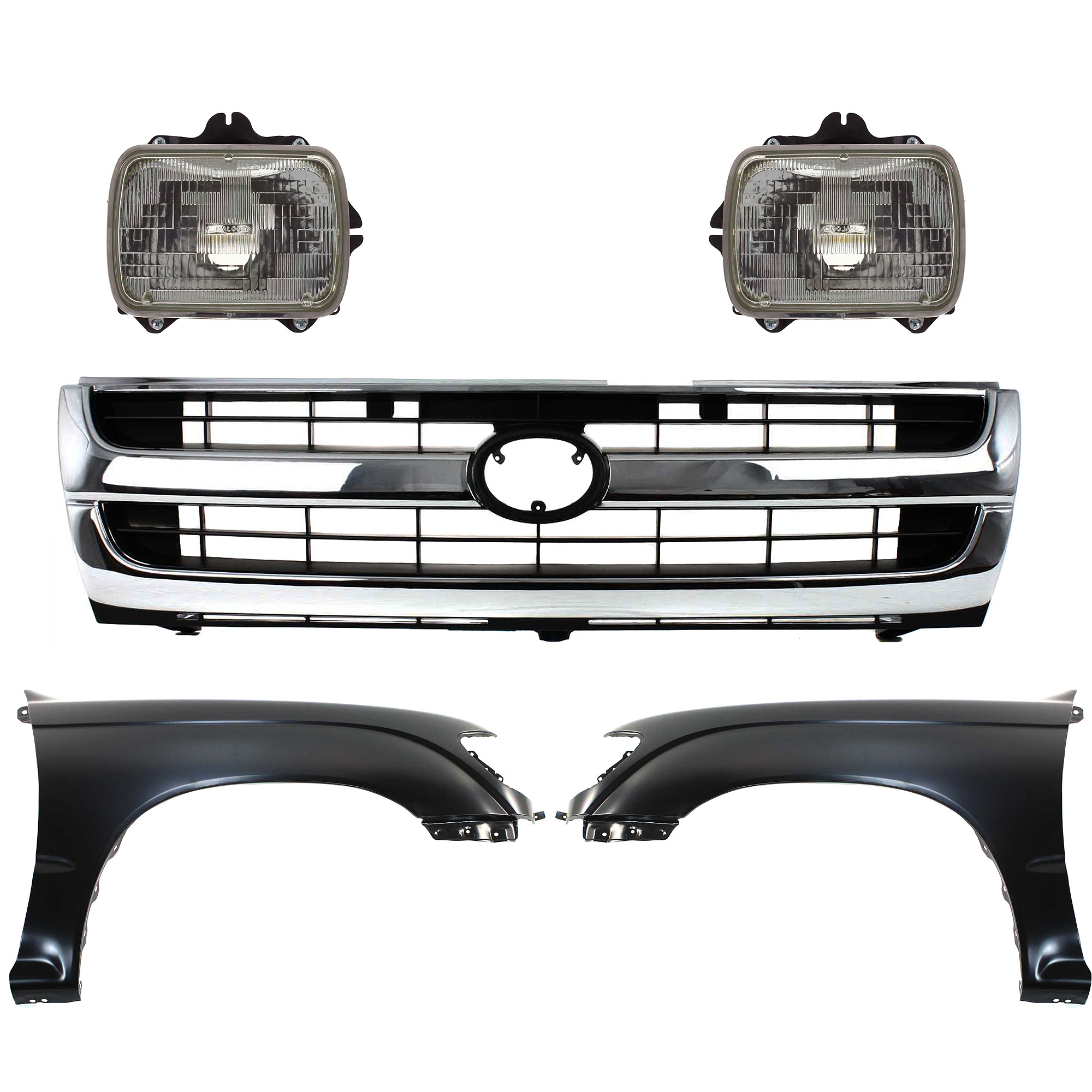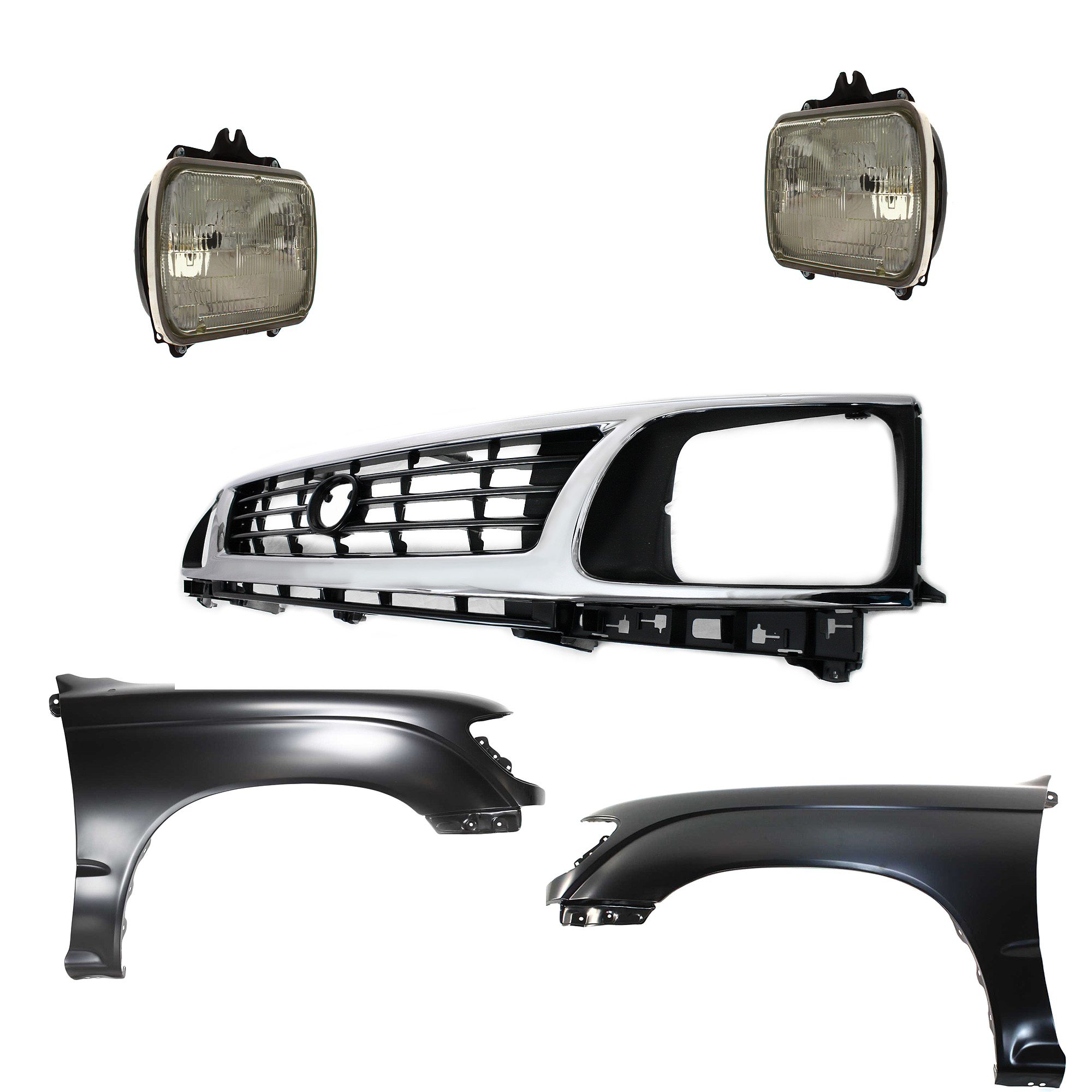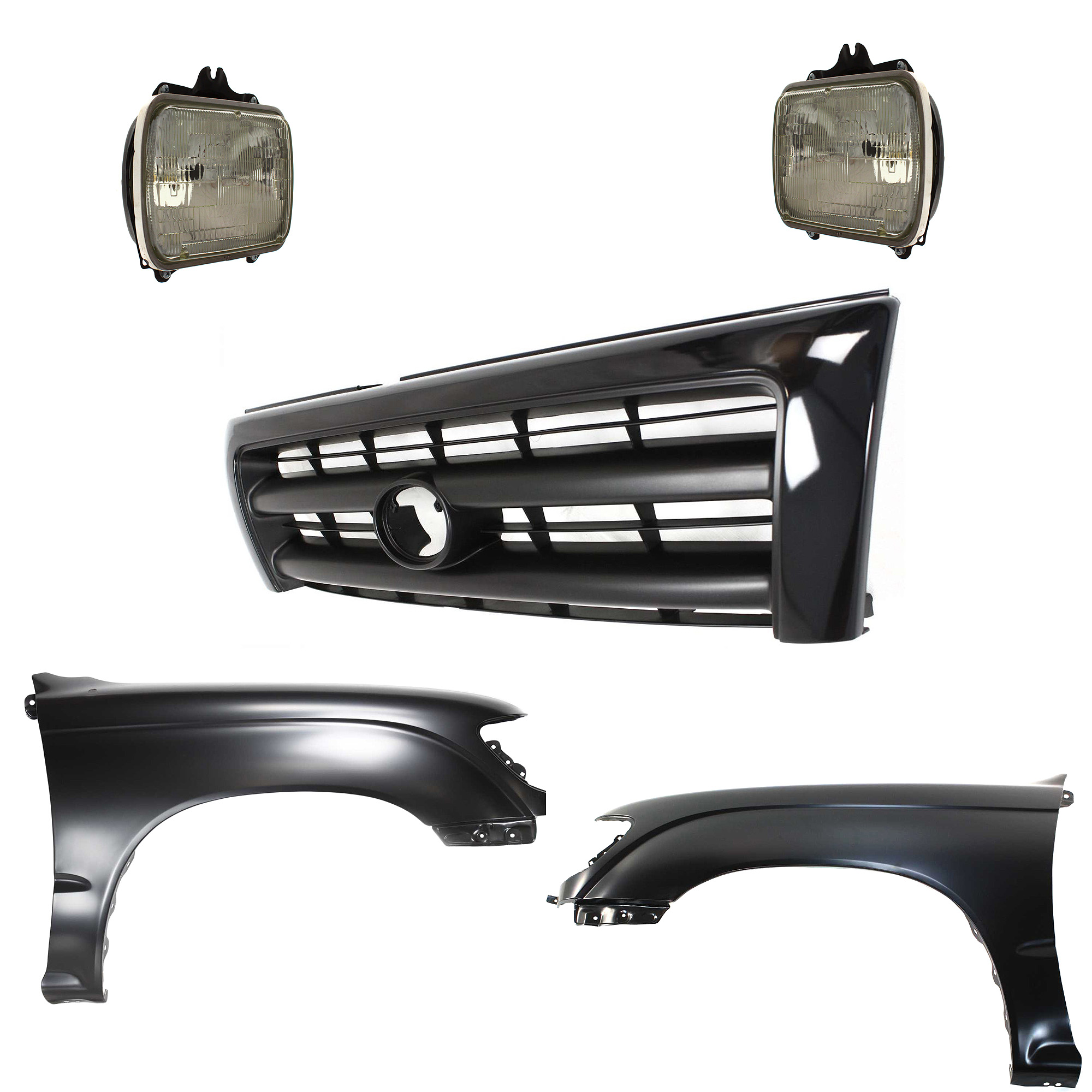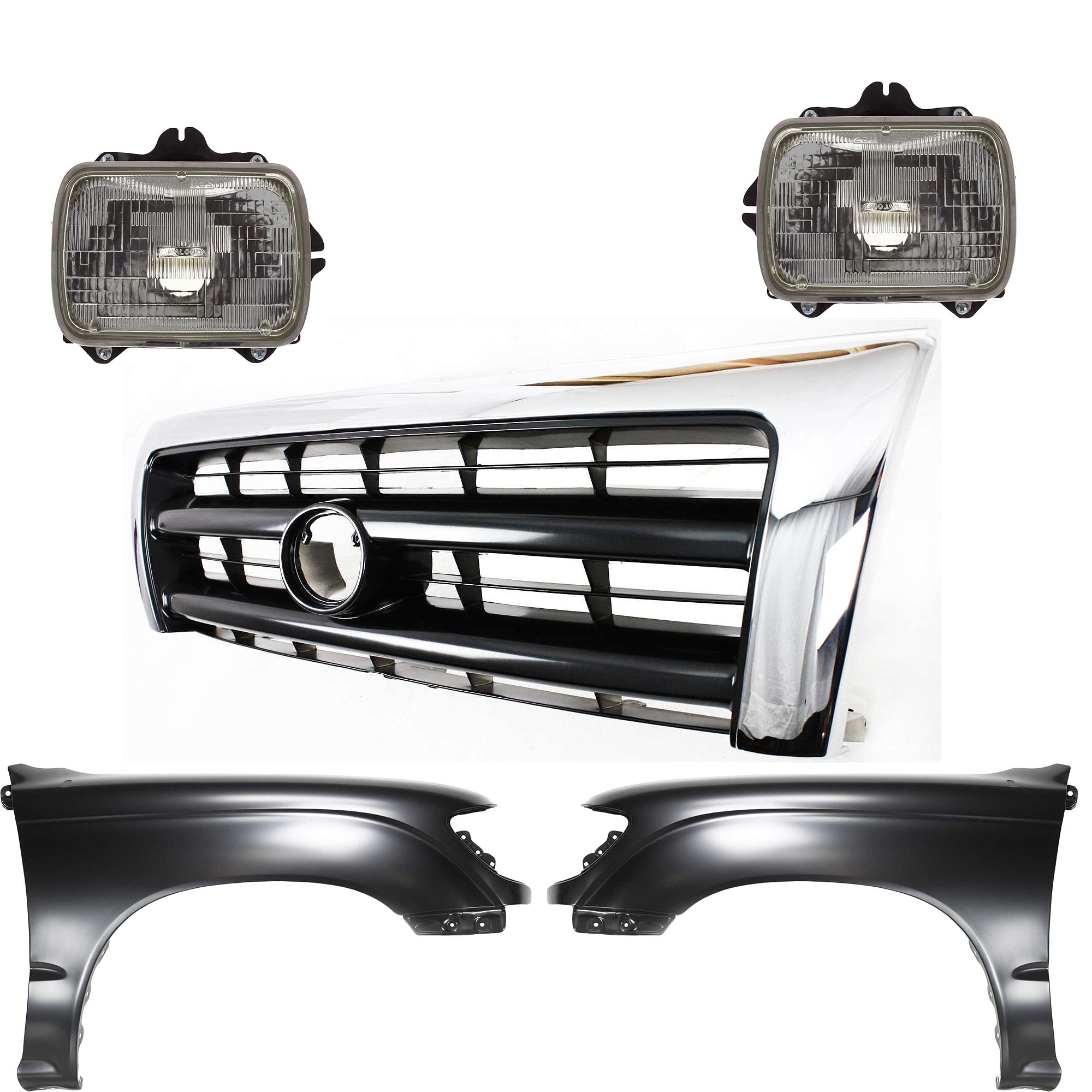 Front Fender Kit for Toyota Tacoma 1997-2000 with Right (Passenger) and Left (Driver) Sides, Primed (Ready to Paint), 5-Piece Set, includes Grille and Headlights, Replacement